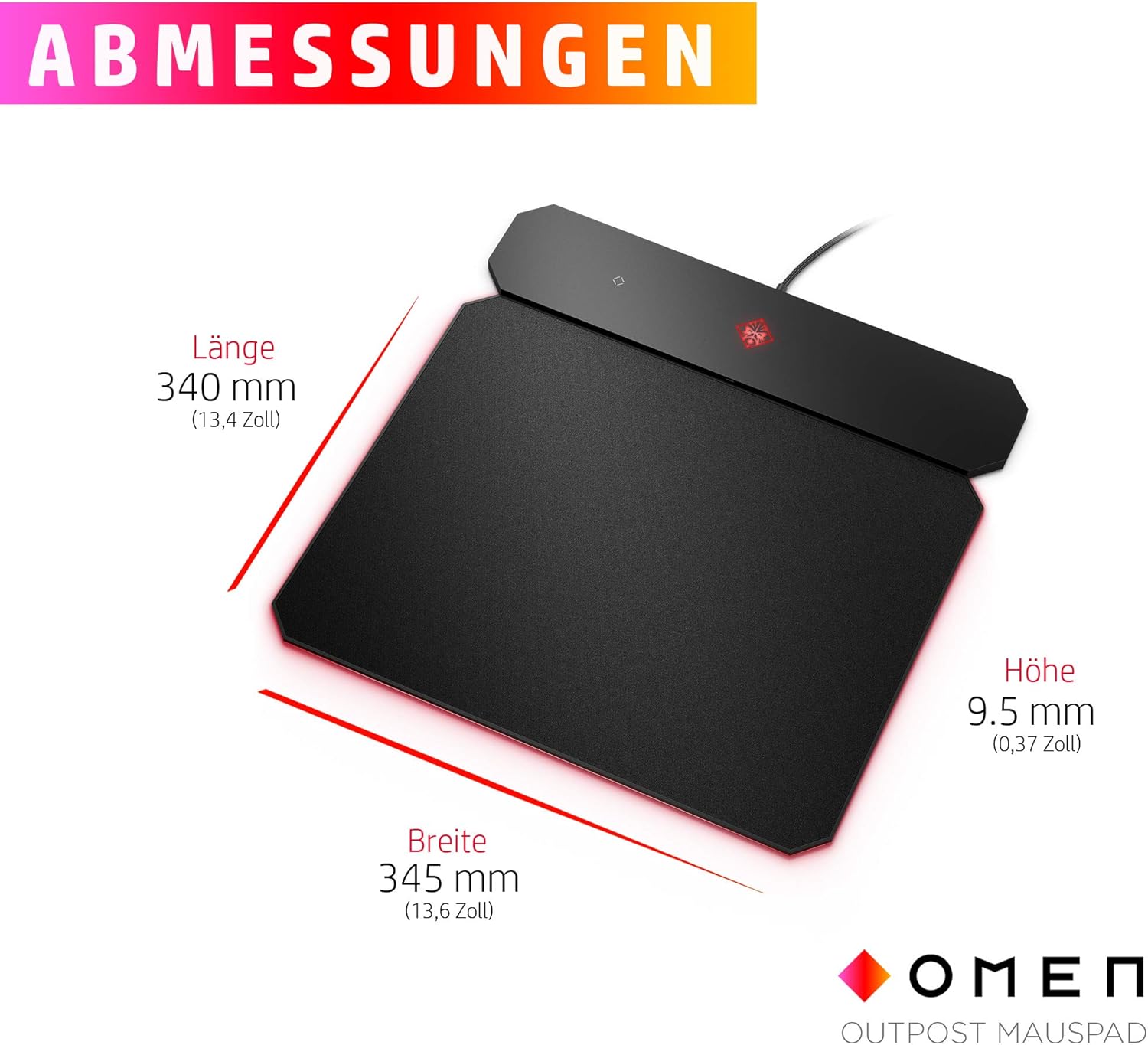 • Lieferumfang: OMEN Outpost Mauspad schwarz; USB-A Adapter; Produktinformationen; Kurzanleitung; OMEN Sticker