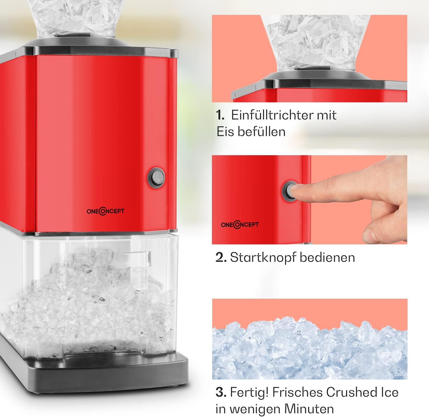 - SCHNELLE ZUBEREITUNG: Schon nach kurzer Arbeitszeit füllt sich der 3,5 Liter fassende Auffangbehälter mit perfekt zerkleinerten Eisstückchen. Bis zu 15 kg Crushed Ice schafft der OneConcept Eiszerkleinerer in der Stunde, ohne 'Schnee' zu erzeugen.