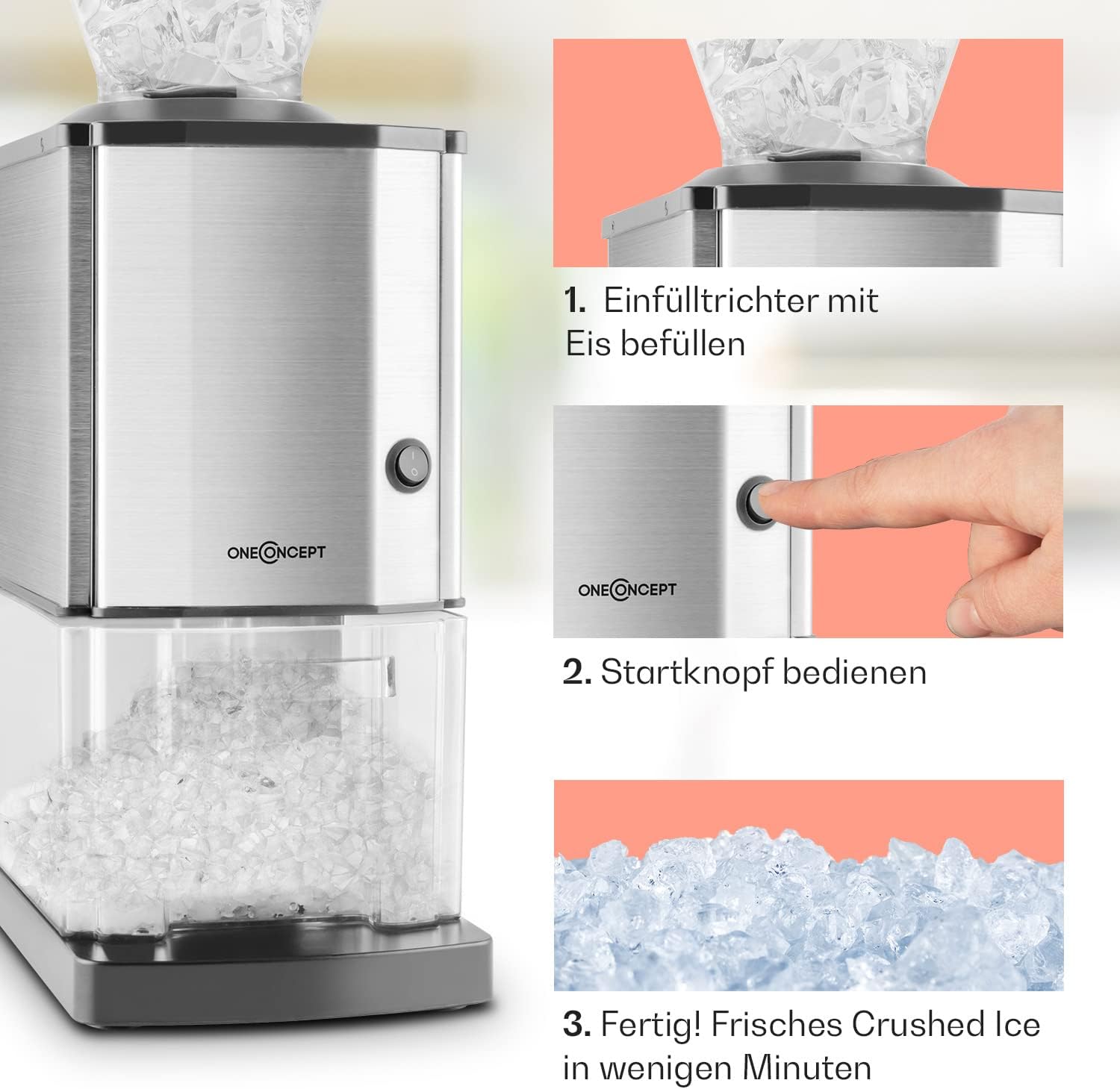 - COOLER EDELSTAHLLOOK: Mit seinem hochwertigen, optisch ansprechenden Gehäuse aus gebürstetem Edelstahl macht der oneConcepts Icebreaker Ice Crusher auch äusserlich eine coole Figur und unterstreicht seine mahlende Zweckdienlichkeit durch den passenden Look.
