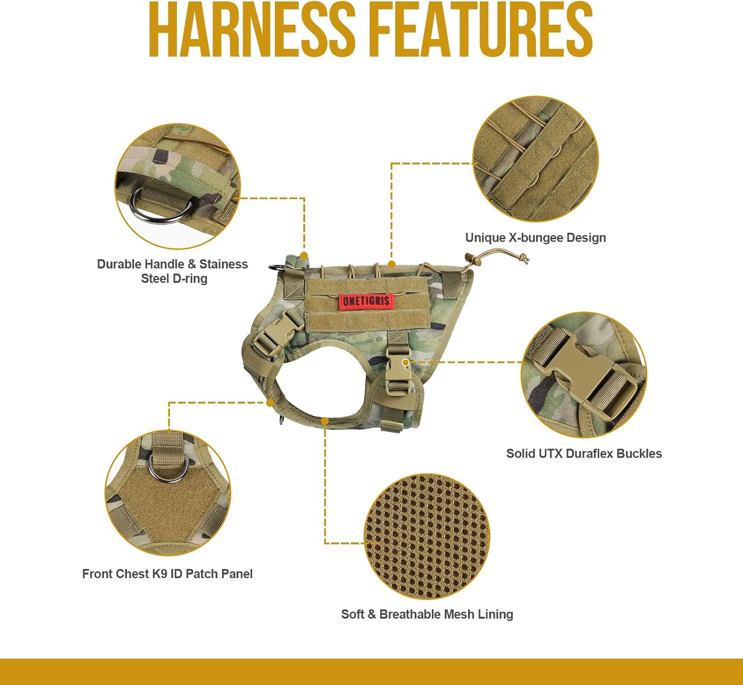 - 【Onetigris Hundegeschirr im Militärstil】Das grosse Onetigris Hundegeschirr verfügt auf jeder Seite über zwei Gurte sowie ein Hook & Loop-Panel zur einfachen Befestigung von Beuteln oder ID-Panels; das Hundegeschirr ist nicht dafür ausgelegt,