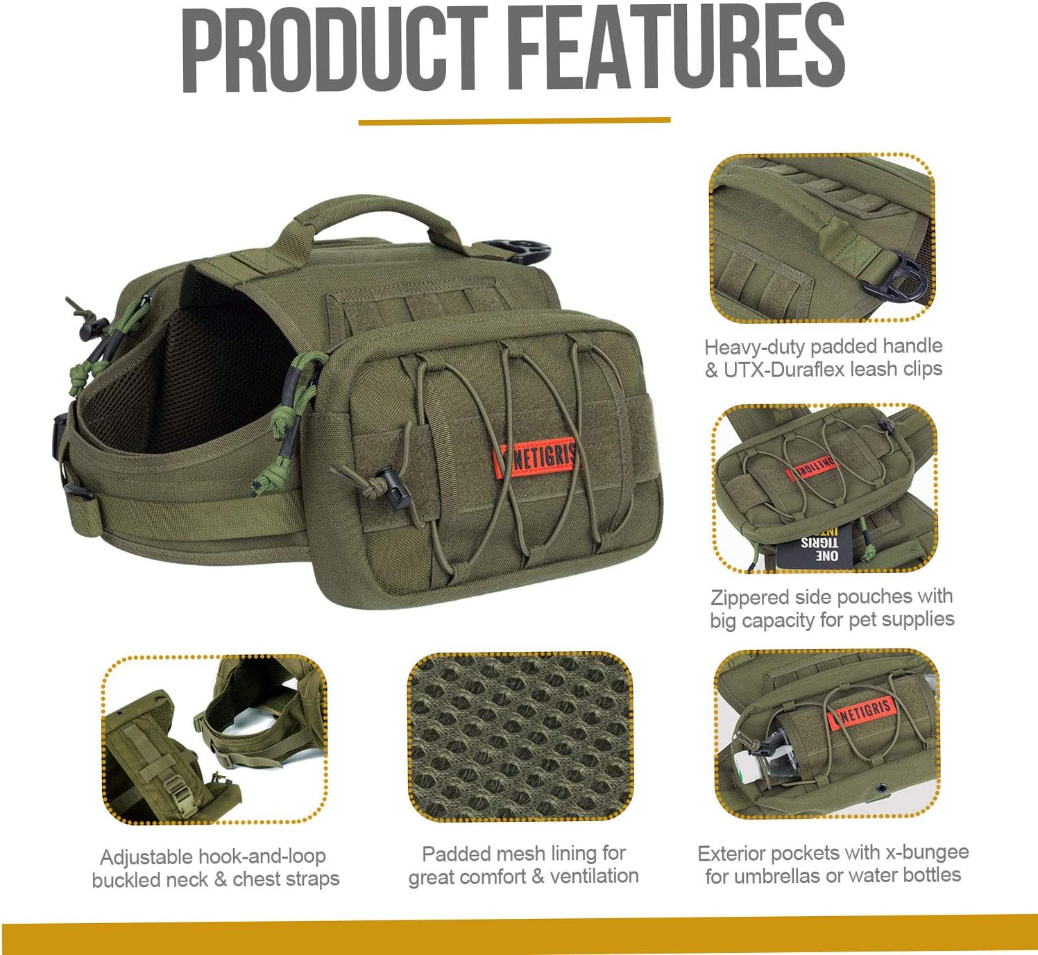 - 3L Beutel auf beiden Seiten zum Tragen von Wasser, Hundefutter, Leckerlis, Spielzeug usw.;Aussenschirmtaschen mit Cross-Bungee-Kordeln zum Befestigen zusätzlicher Ausrüstung.