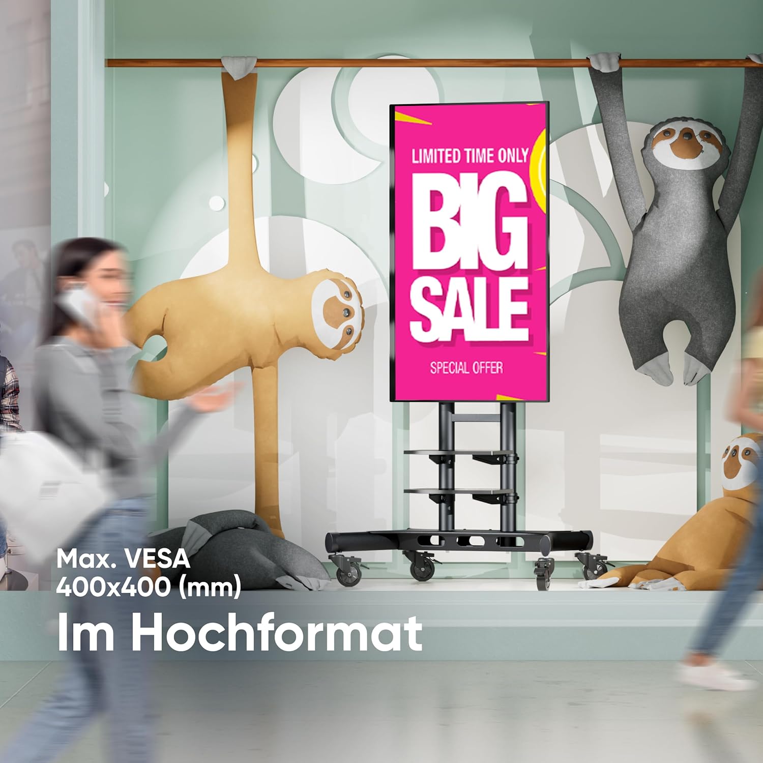 • PRAKTISCHER TV STÄNDER MIT ROLLEN | Standfuss für TV Rollwagen hat gummierte Räder mit Feststellsystem, die das Bewegen des Ständers erleichtern | Kabelführungen im TV Wagen mit Rollen helfen, die Kabel ordentlich zu verstauen | Fernseh Rollwagen