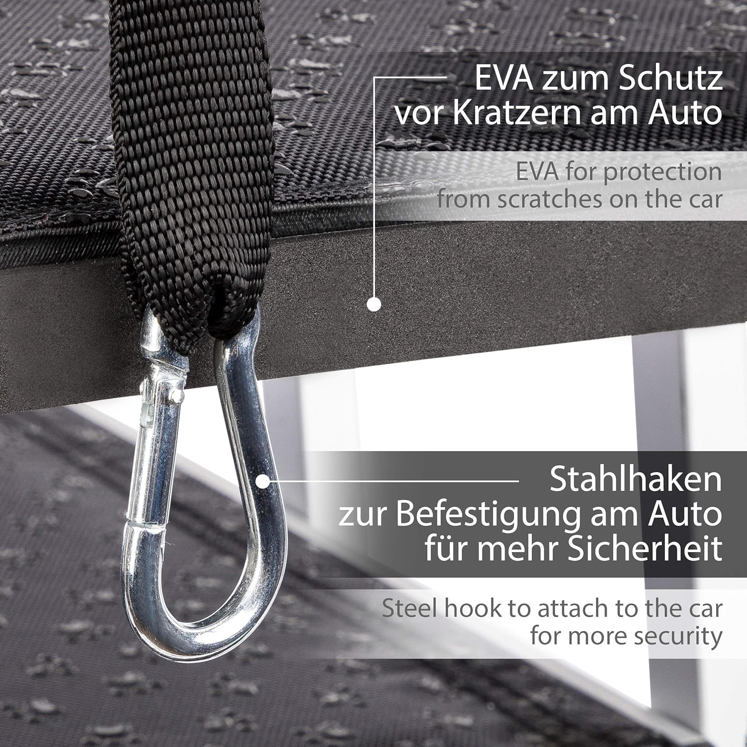 - Dank einem EVA Schutz an der Leiter sowie Griffen aus Schaumstoff werden Kratzer am Auto vermieden