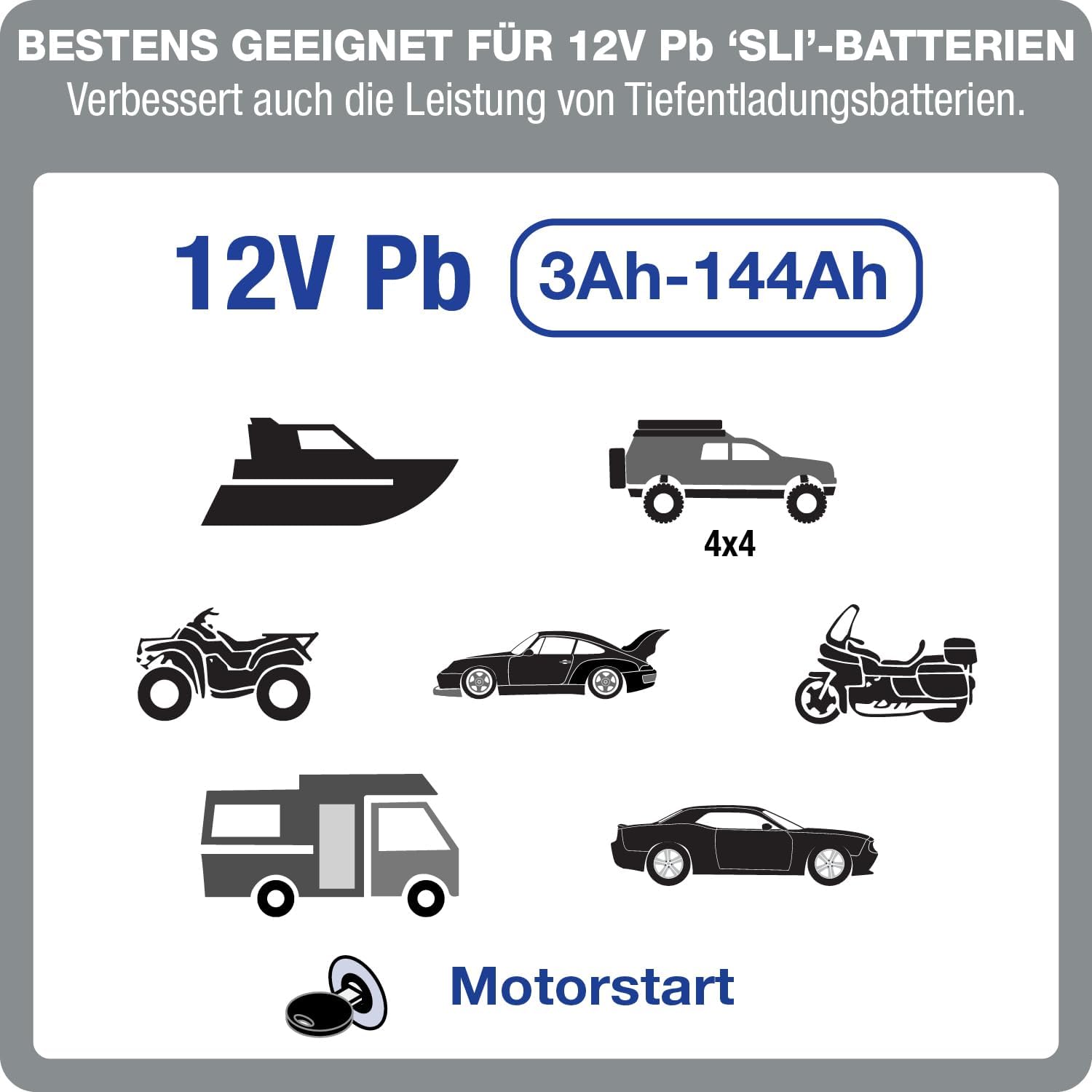 • Ideal für 12V-Blei-Säure-Batterien in den oben genannten Fahrzeugen/Booten.