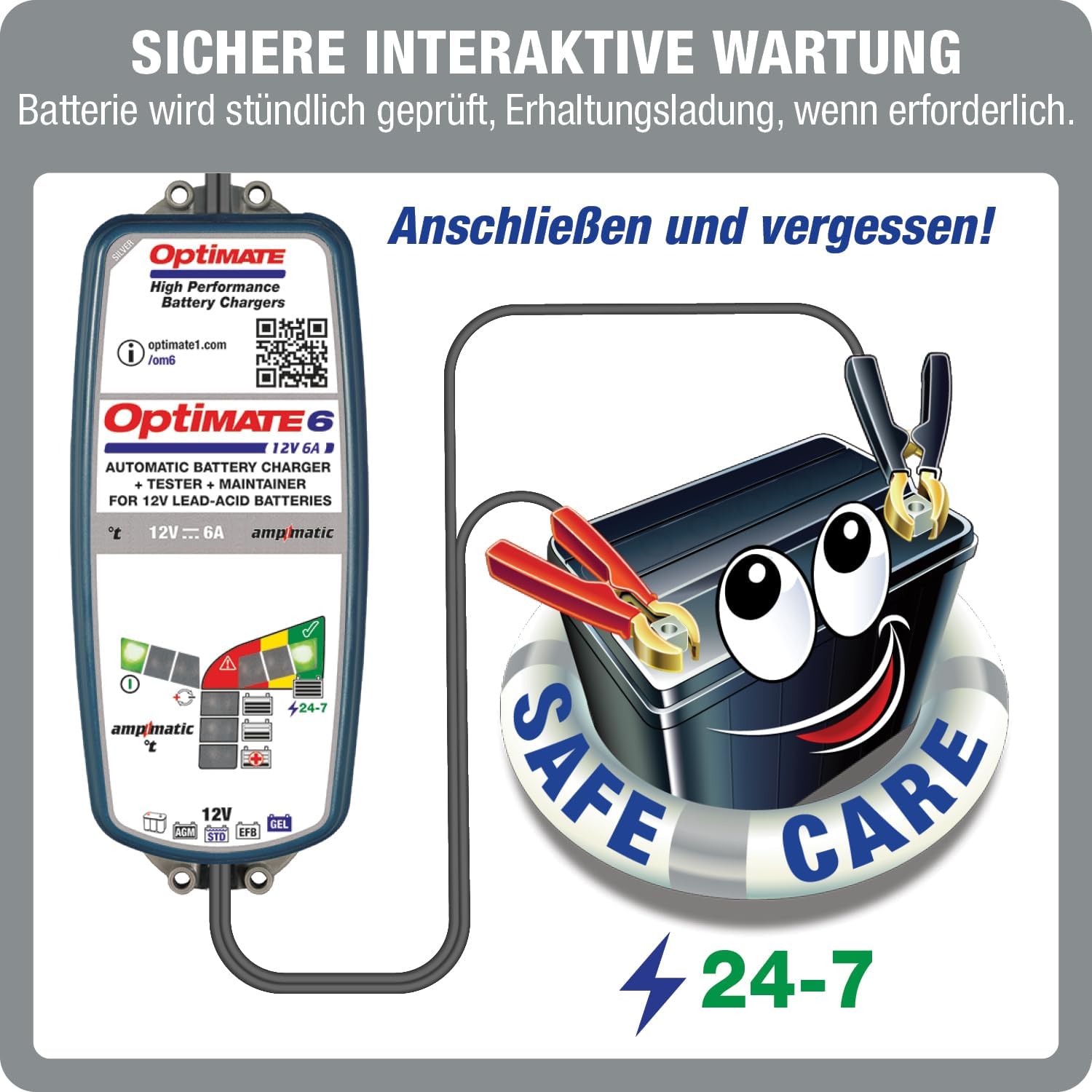 • An die Batterie anschliessen und OptiMate 6 Ampmatic erledigt den Rest, keine Aufsicht erforderlich!