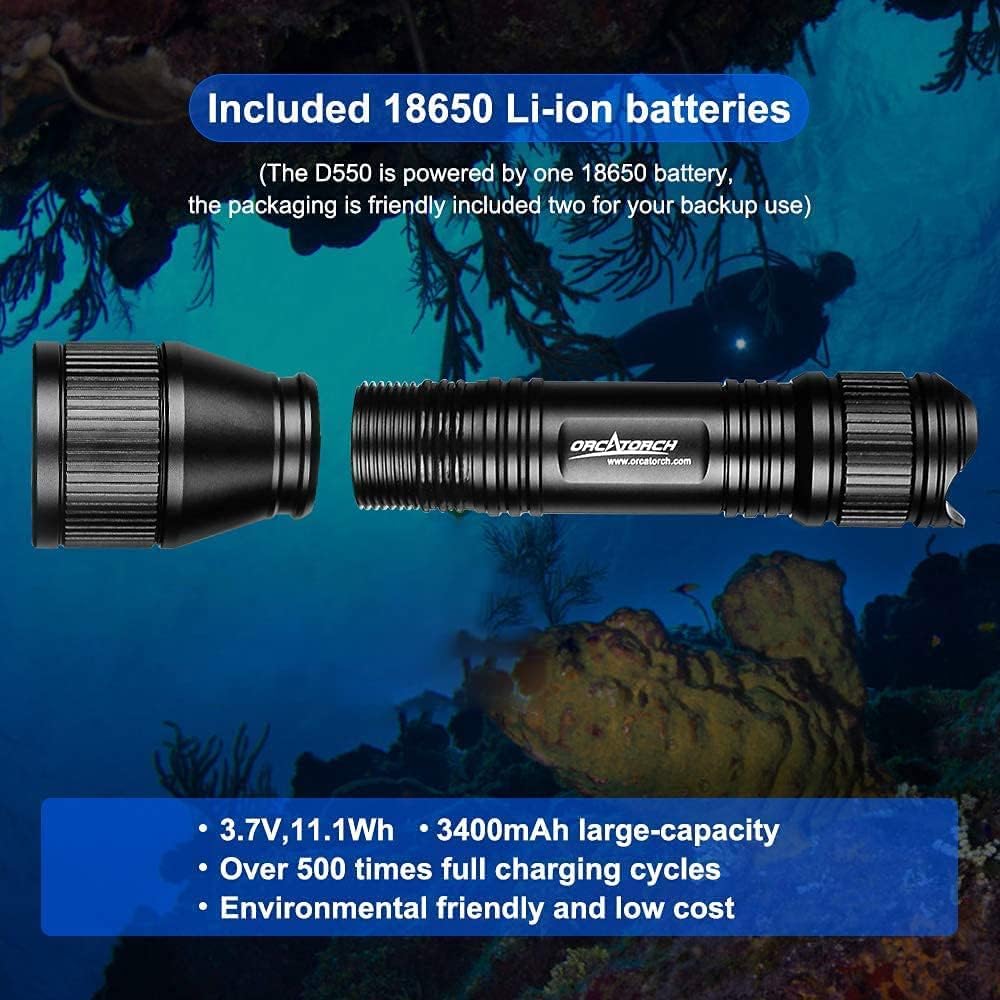 - DREI LICHTMODI: Diese Tauchlampe hat drei Modi, hoch, mittel und versteckten Blitzmodus. Sie können die Helligkeit entsprechend der Unterwasserumgebung anpassen und so Strom sparen.Die D550 hielt 2 Stunden und 5 Minuten im High-Modus und 5 Stunden und