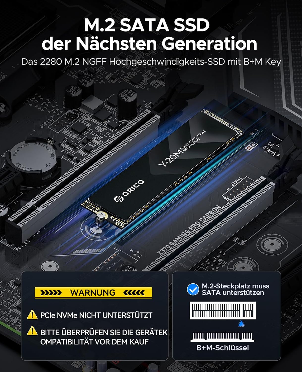 - Breite Kompatibilität: Die ORICO M.2 SATA SSD 2280 ist mit verschiedenen Laptops und Desktops kompatibel, die über eine M.2 SATA B+M Key-Schnittstelle verfügen, und ist somit ideal für die Aufrüstung Ihres Systems geeignet