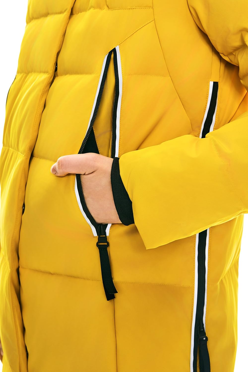 - Fokus auf Details: Glatter Zwei-Wege-Reissverschluss vorne in der Mitte mit Druckknöpfen und gerippten Bündchen für Wärme. Durch das Hochziehen der seitlichen Reissverschlüsse bleiben Sie warm und vor Wind geschützt, während Sie sie öffnen, um
