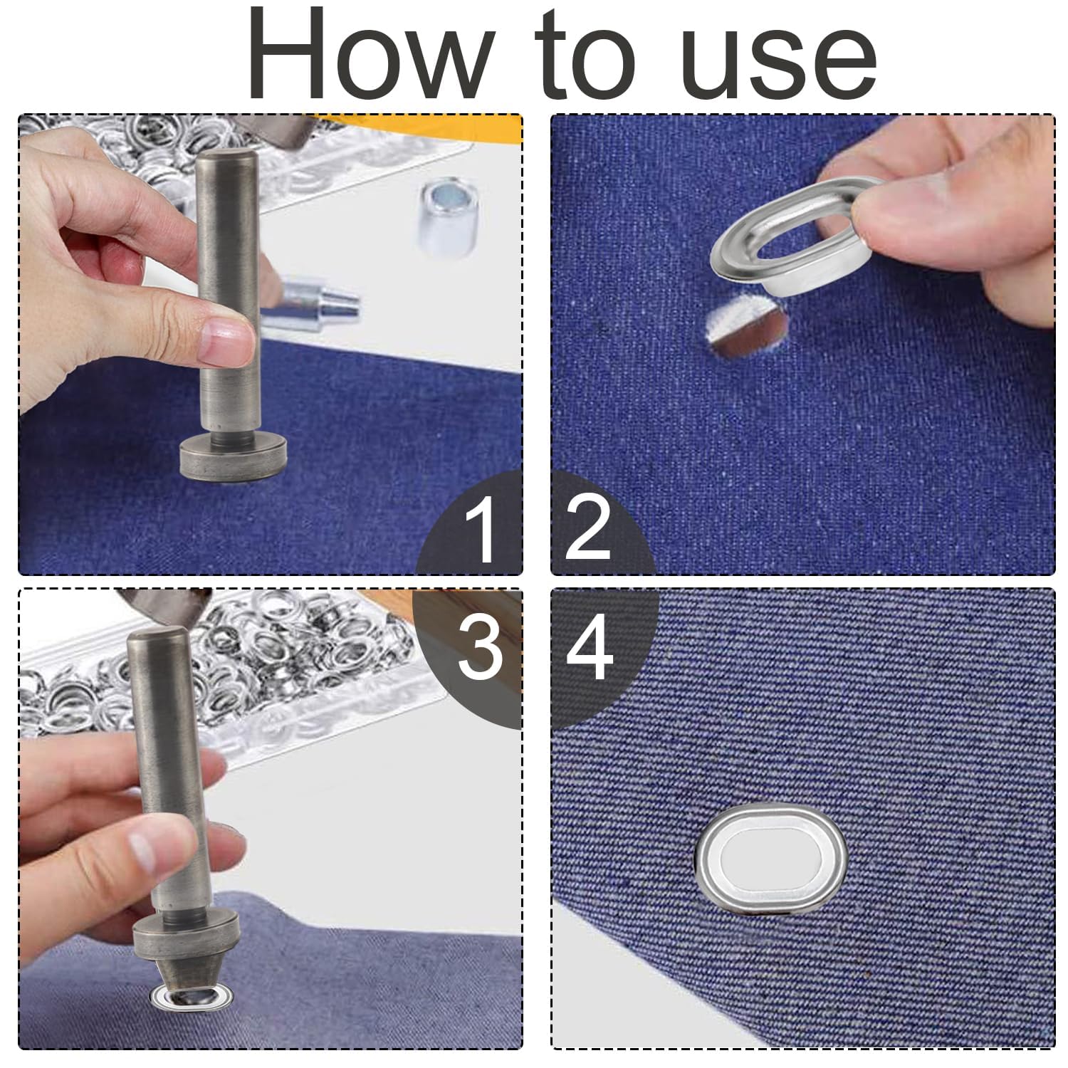 - STANZWERKZEUGE: Ovalösen zeichnen sich dadurch aus, dass Sie durch Drehverschlüsse befestigt werden können. Verwenden Sie einfach einen Locher, um Löcher in den Stoff zu stanzen, und verwenden Sie dann das Installationswerkzeug, um die Ösen zu