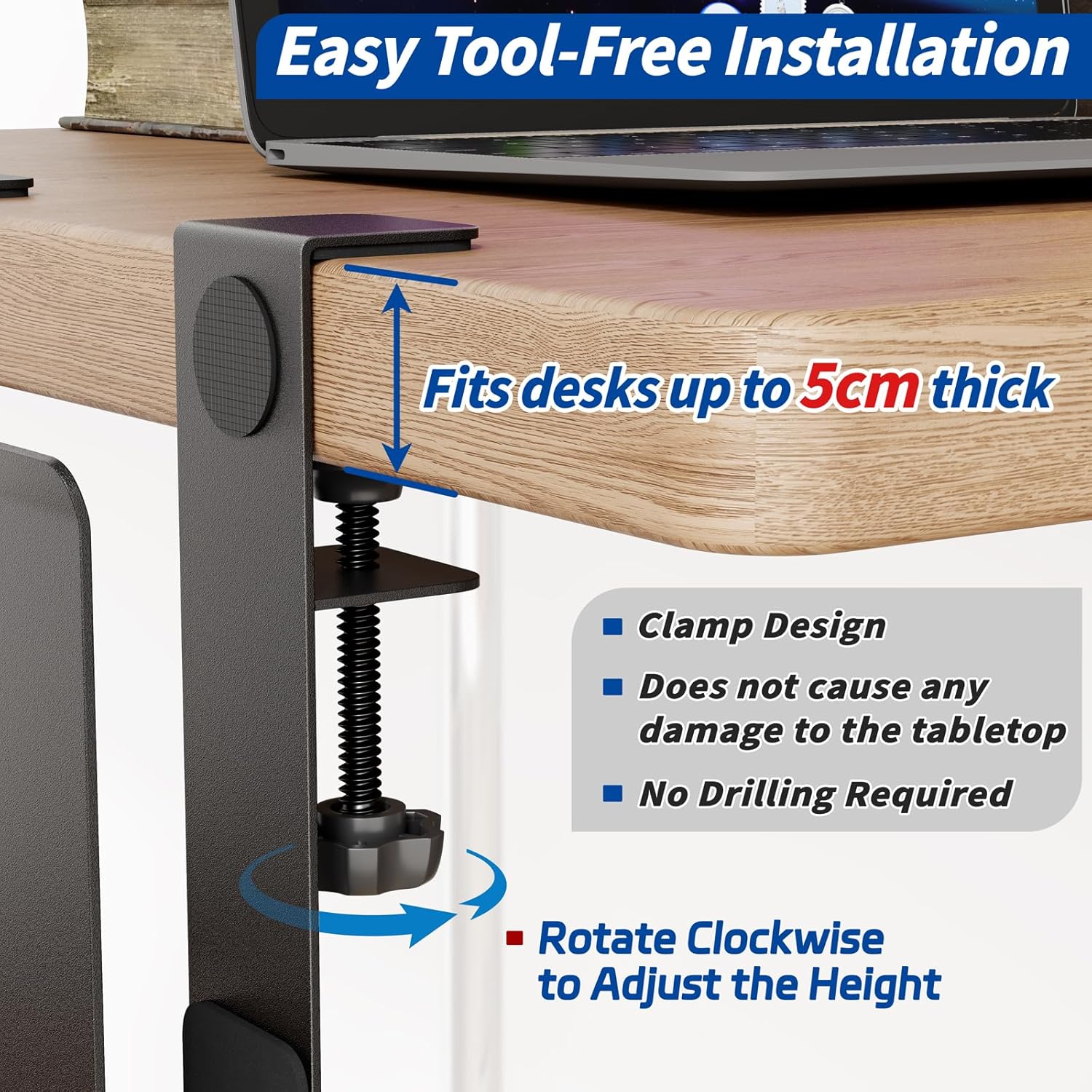 - Werkzeugfreie Montage – Die praktische Klemmbefestigung passt an Schreibtische bis zu einer Dicke von 5cm. Kein Bohren, keine Schrauben, keine Werkzeuge nötig – einfach anklemmen und fertig.