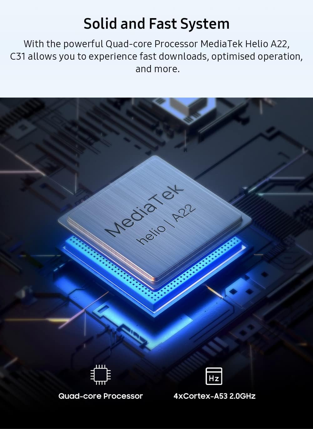 - ★【Solides und flottes System:】Mit dem leistungsstarken Quad-Core-Prozessor MediaTek Helio A22 ermöglicht das C31 schnelle Downloads, optimierte Bedienung und vieles mehr (3GB+16GB, unterstützt externe SD-Karte bis zu 256GB).