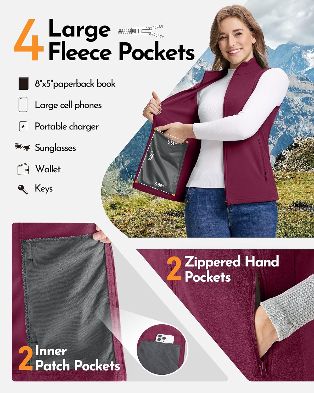 - 4 grosse Taschen: Diese ärmellose Fleecejacke hat einen durchgehenden Frontreissverschluss mit hochwertigen glatten Reissverschlüssen (SBS Zipper). Sie hat 2 grosse Aussentaschen mit Reissverschluss für die Hände und 2 tiefe, oben offene Innentaschen