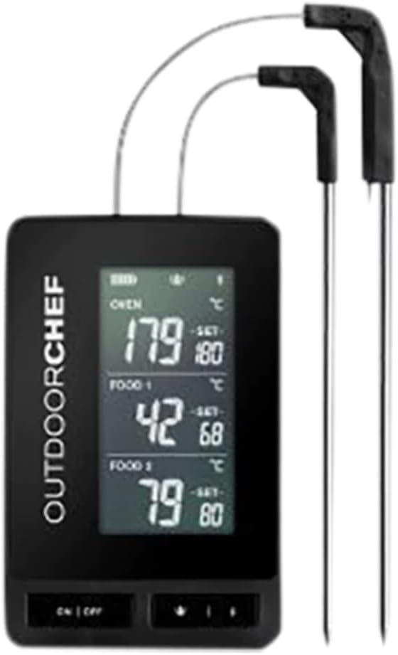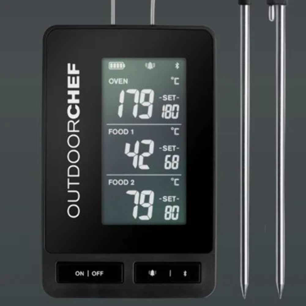 - Das per App gesteuerte Bluetooth-Grillthermometer überträgt drei Kern- und Umlufttemperaturen direkt aufs Smartphone oder Tablet und sorgt so für erstklassige Garergebnisse. Zwei Messfühler informieren über die Temperatur im Fleisch und im Grill und