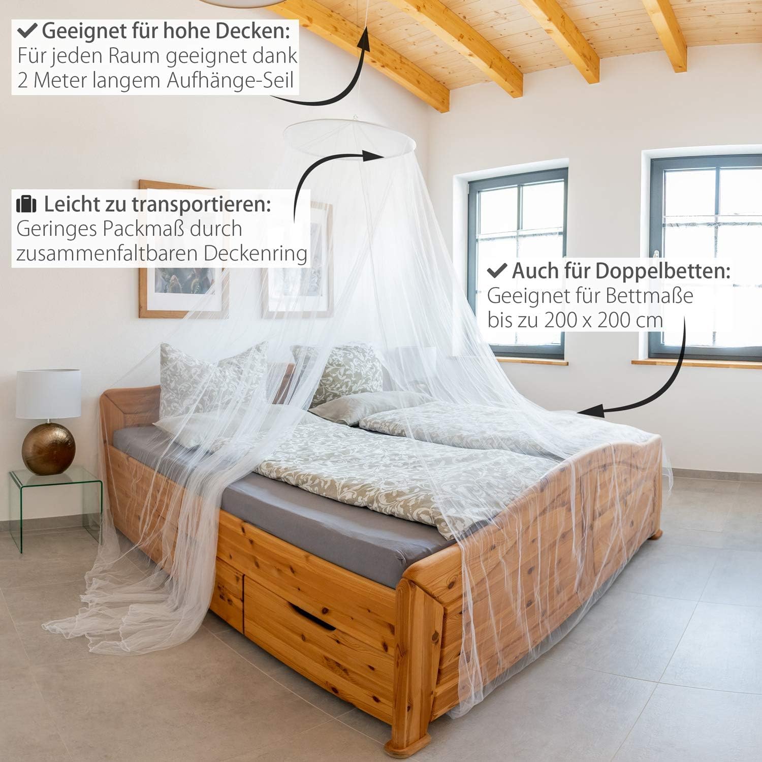 - UNIVERSELL UND EXTRAGROss: Dank der grosszügigen Masse ist das engmaschige Fliegennetz für Doppelbetten, Einzelbetten und Kinderbetten geeignet. Mit dem langen Montage-Seil kann das Mückennetz auch an sehr hohen Decken befestigt werden.
