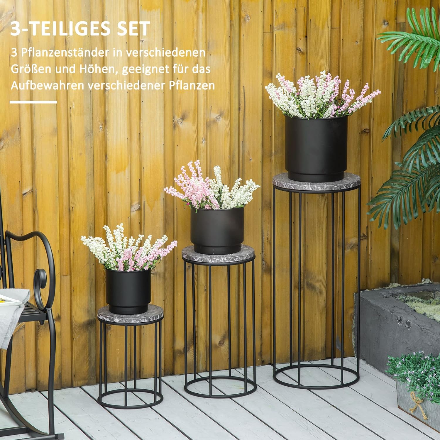 - STAPELBAR: Die 3 unterschiedlich grossen Pflanzenständer können bei Bedarf bequem und platzsparend ineinander gestapelt werden, um Raum für andere Dinge freizugeben.