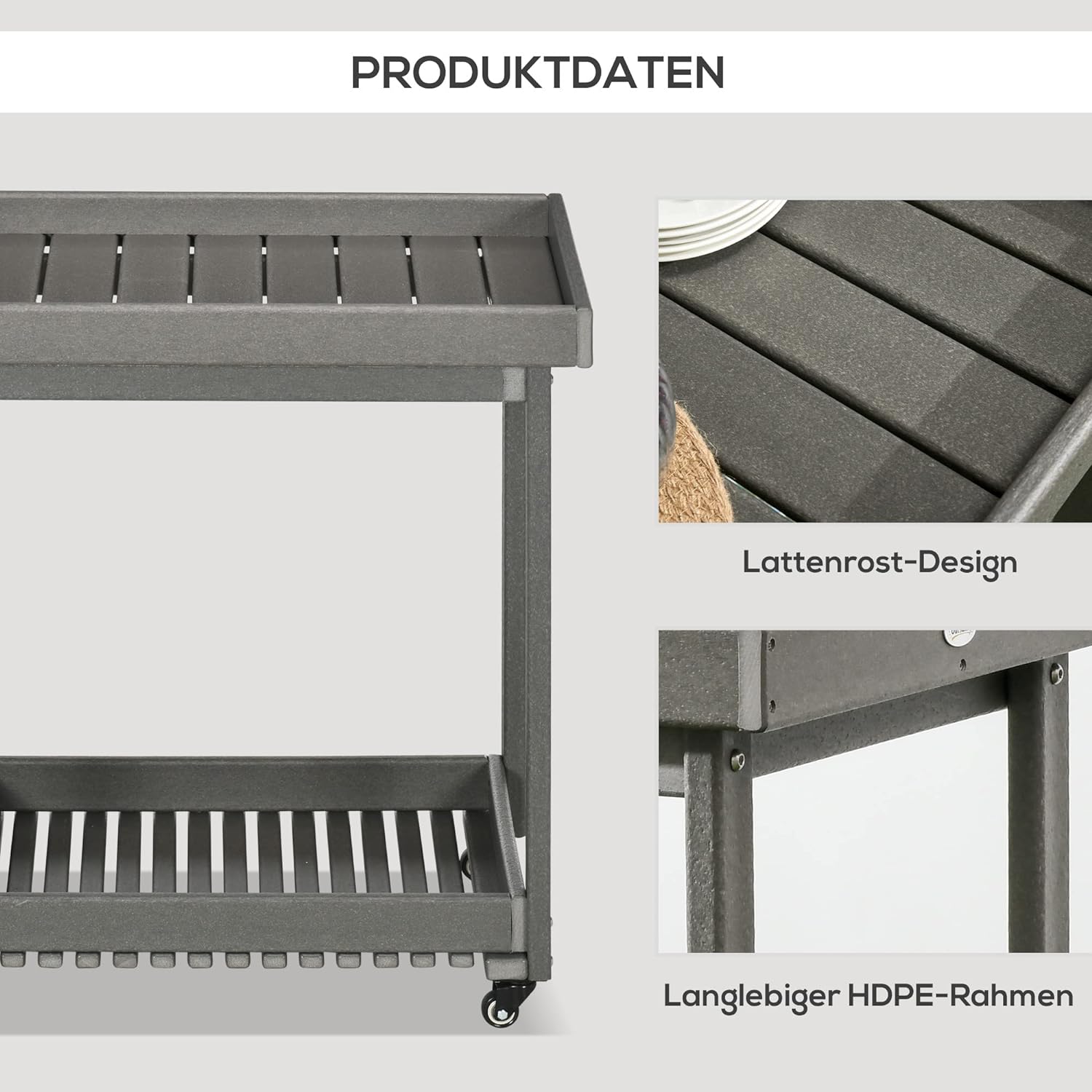 • Ausgewähltes Material: Dieser Wagen besteht aus HDPE, welches wasser-, riss- und korrosionsbeständig ist. Das Material gewährleistet Stabilität und kann bis zu 50 kg tragen. Die Lamellenkonstruktion ermöglicht ein schnelles Trocknen nach Regen.