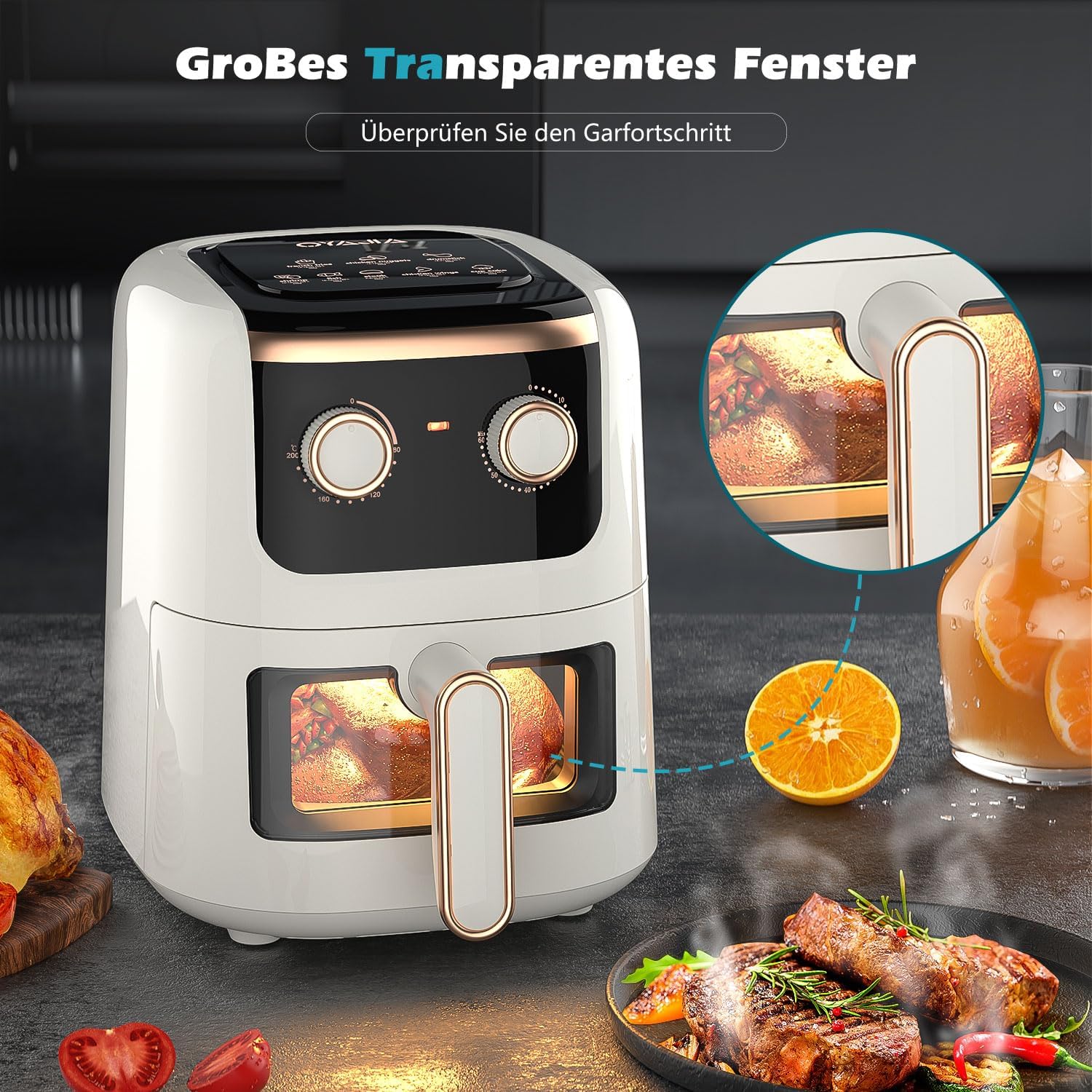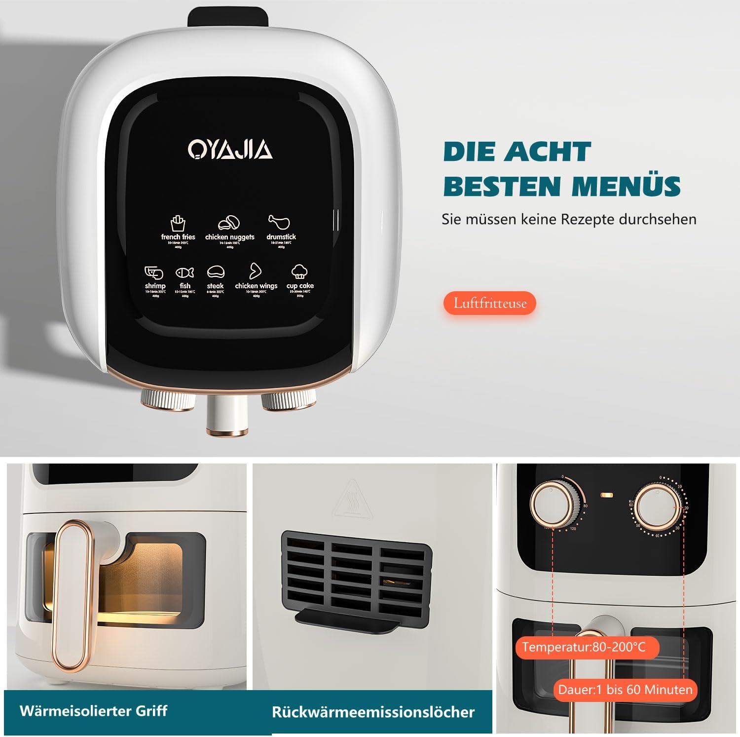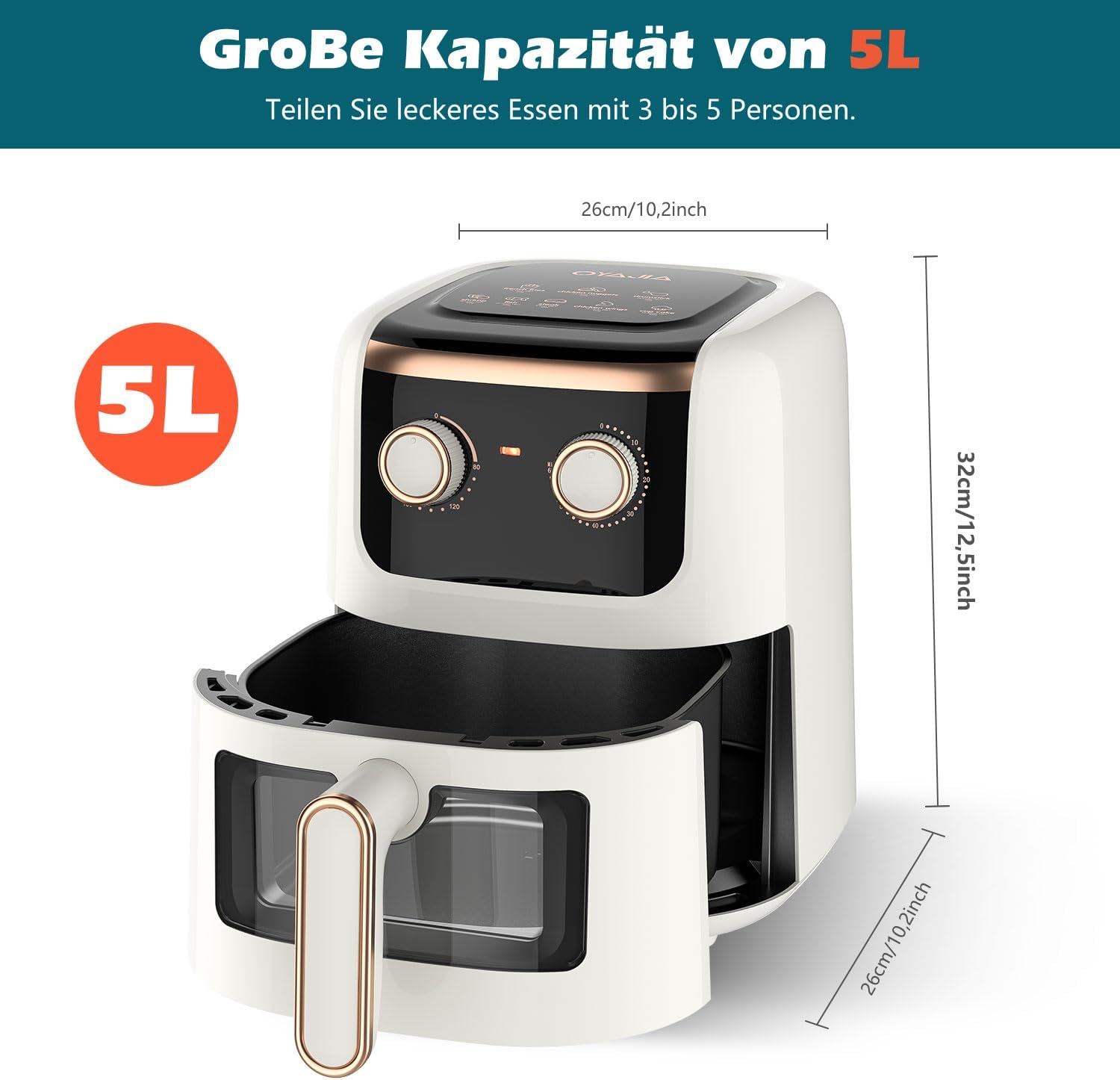 Oyajia 5L Heissluftfritteuse mit Sichtfenster, mit Manueller Drehtaste, Spülmaschinenfest, Gesundes
