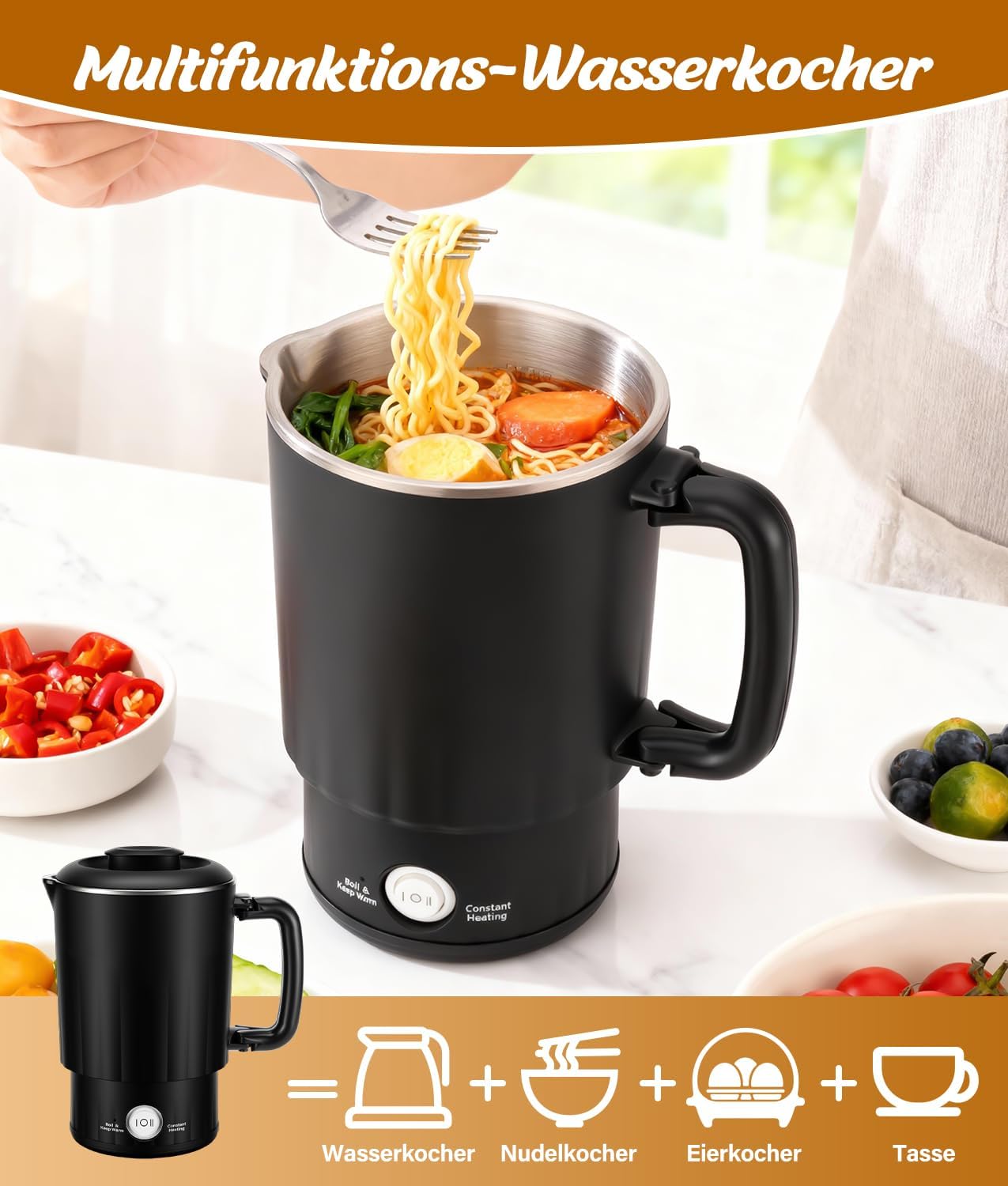 - Zwei Betriebsmodi: Im Modus „Kochen“ werden 600 ml in ca. 5 Minuten zum Kochen gebracht; im Modus „Warmhalten“ wird die gewählte Temperatur für den sofortigen Gebrauch beibehalten. Hinweis: Im Modus „Kochen“ schaltet sich der Wasserkocher