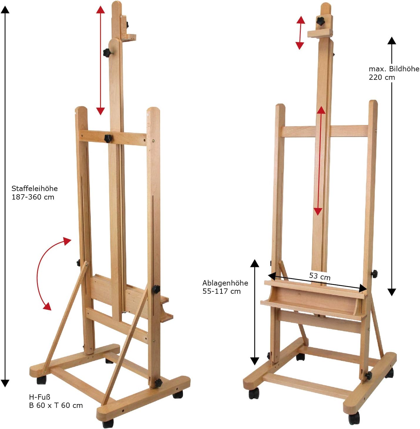 - STABIL: Die Staffelei LIMA XL ist eine robuste und grosse Atelier-Staffelei aus feinem, lasiertem Buchenholz vom Fachhändler für Künstlerbedarf. Sie zeichnet sich durch hohe Stabilität aus, da sie eine grosse H-Auflagefläche (60x60cm) hat. Durch 4