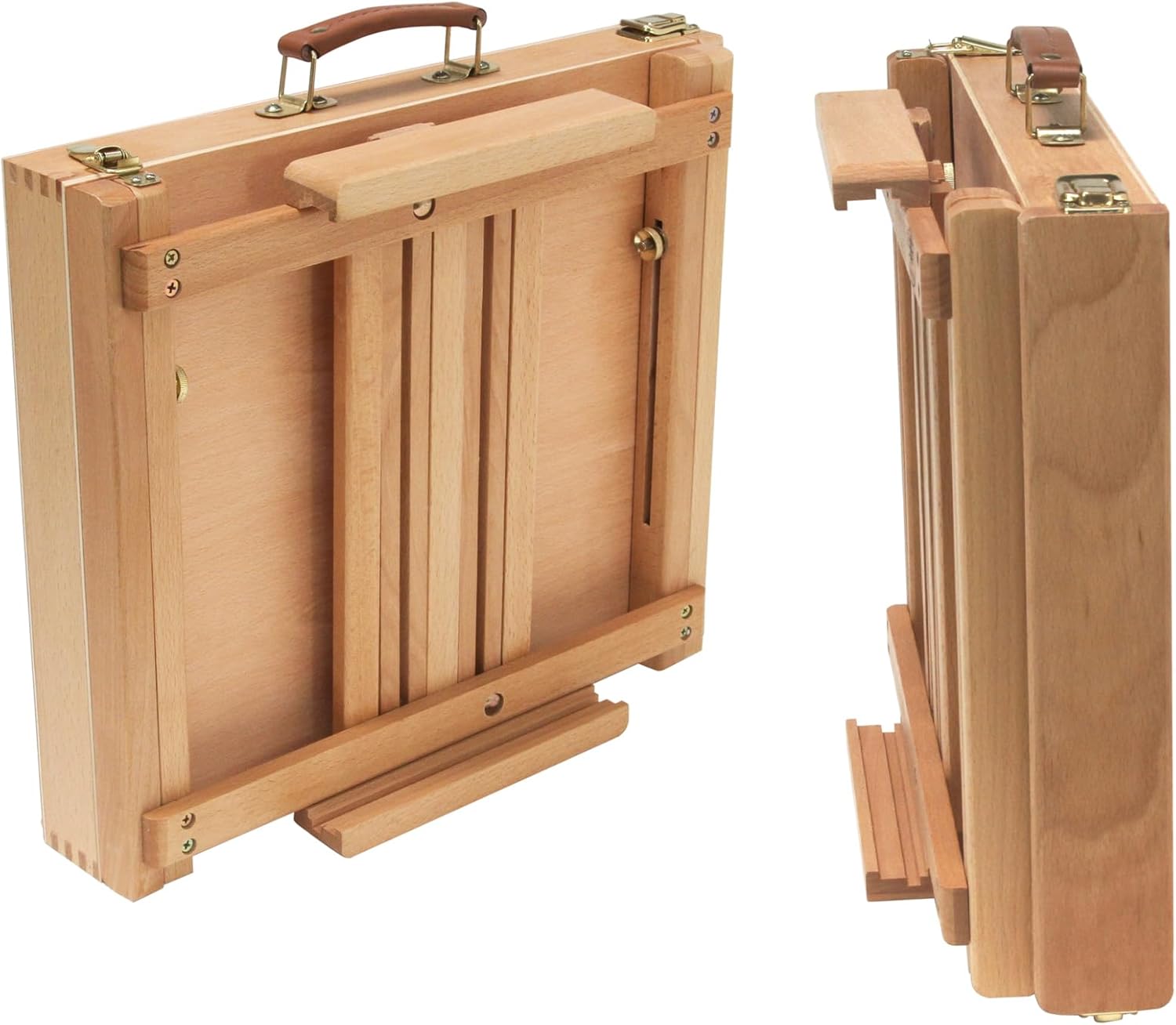 - QUALITÄT: Die professionelle Tischstaffelei besteht aus fein lasiertem Buchenholz mit edler Oberfläche. Die Deckflächen bestehen aus verleimtem Mehrschichtholz. Das verwendete Holz ist aus FSC lizensierter Fertigung aus kontrolliertem Anbau und kein