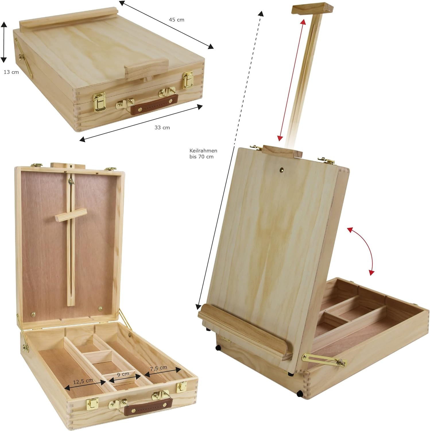 - ✔ TISCHSTAFFELEI: Beim Öffnen des Koffers verwandelt sich der Deckel in eine grosse verstellbare Tischstaffelei, auf der Keilrahmen bis zu 70cm im Hochformat eingespannt werden können. Der Koffer hat zwei messingfarbene Verschlüsse, einen stabilen Tragegriff sowie vier Gummifüsse. Ideal eignet er sich auch als Utensilienkoffer zur Aufbewahrung diverser Malartikel.