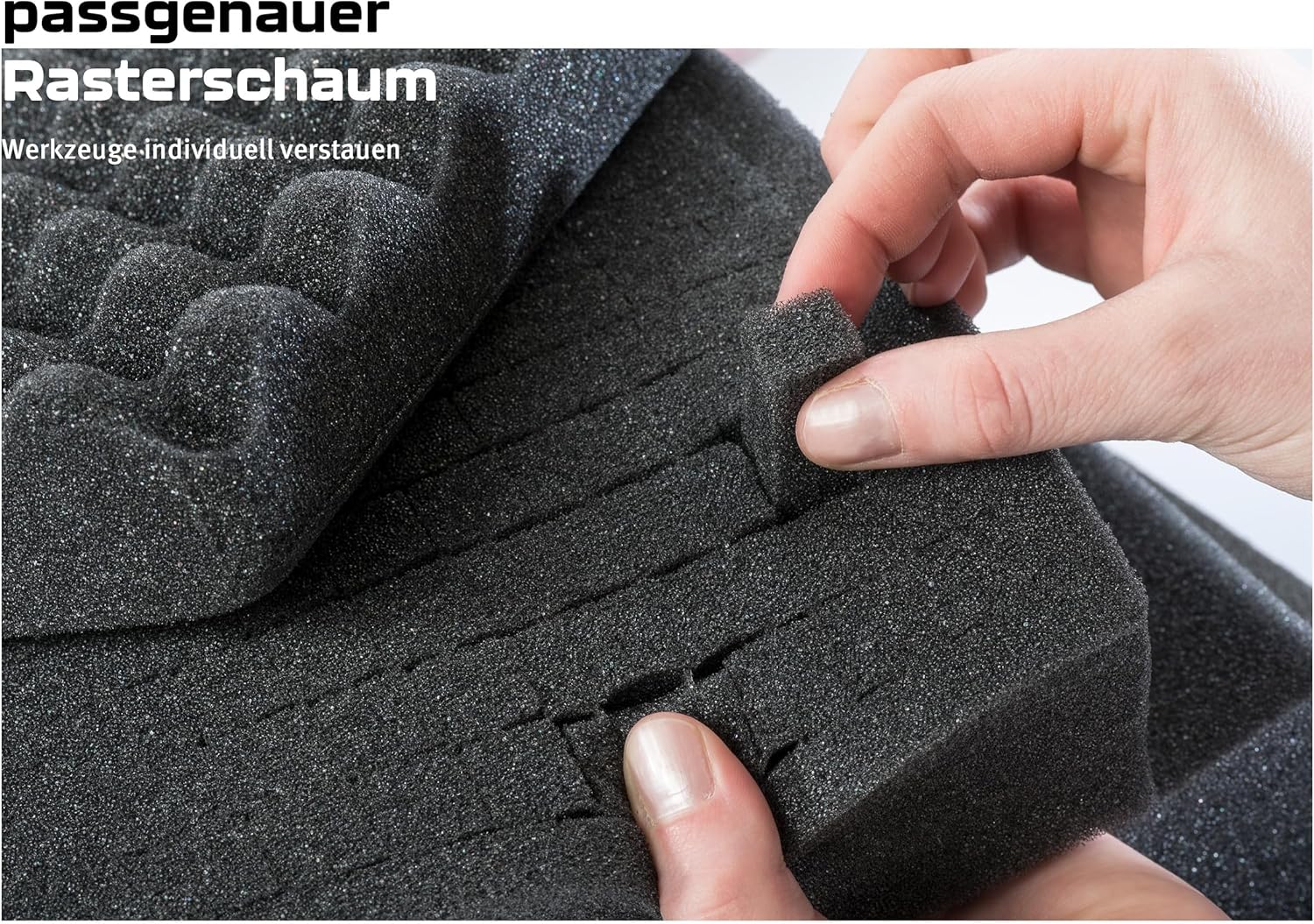 - Lochungen für Vorhängeschlösser sichern den Inhalt, der in passgenauen Schaumstoffeinsätzen auf Zugriff wartet.
