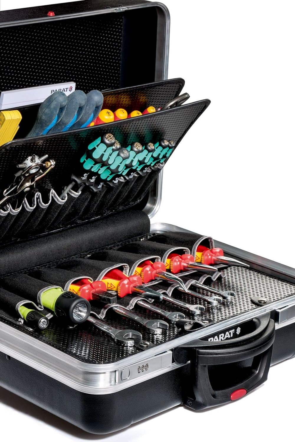 - Der Premium-Werkzeugkoffer verfügt über eine robuste, rutschhemmende X-ABS Aussenschale, welche durch einen umlaufenden Doppelaluminiumrahmen verstärkt und somit bis zu 30 kg belastbar ist.