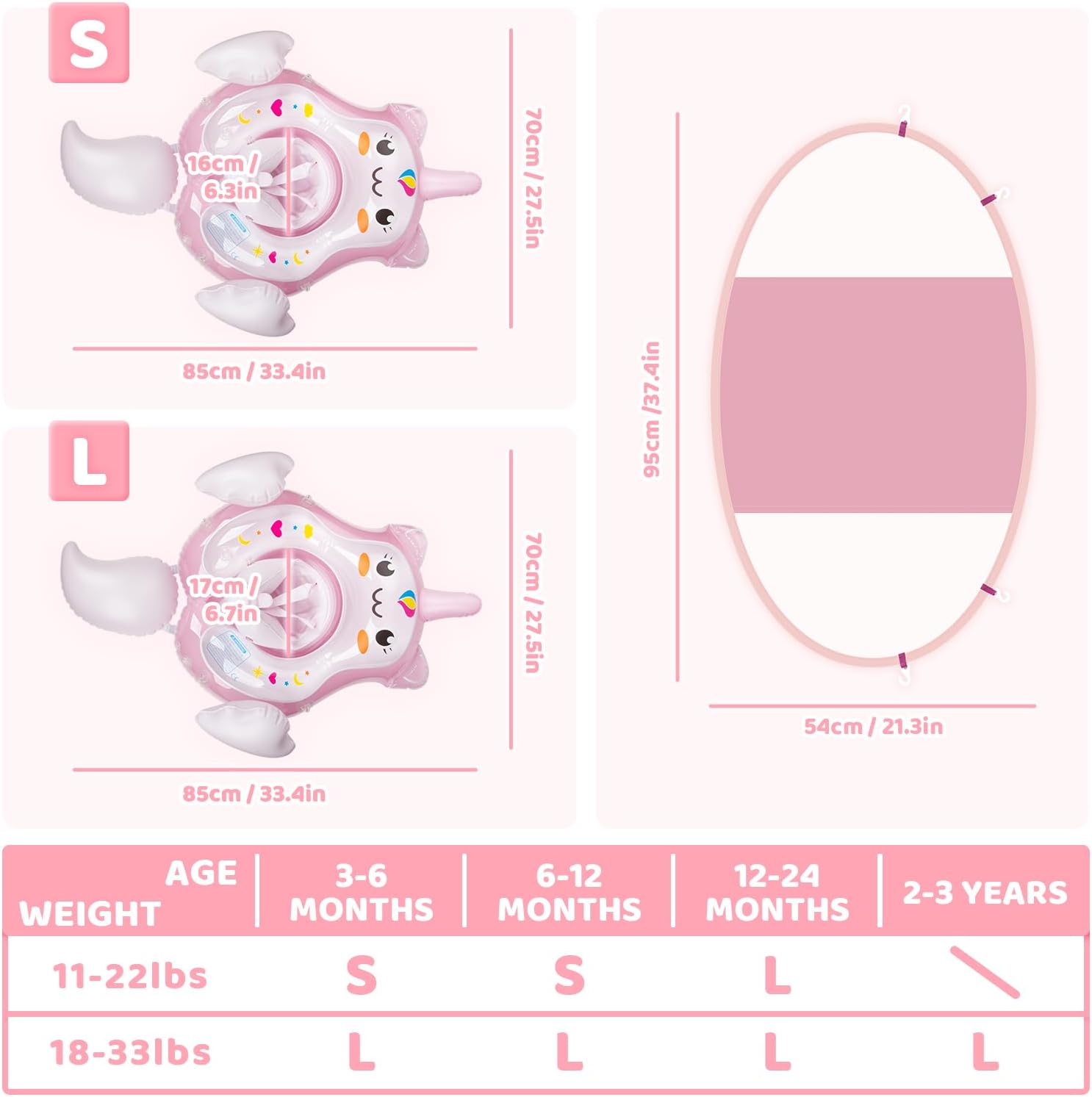- Empfohlene Grösse: Empfohlen für Gewicht 11-22lbs Alter 0-12Monate (Grösse S); 12-36 Monate (Grösse L); 18-33 lbs 6-36 Monate (Grösse L). Attention: Das baby schwimmreifen ist nicht lebensrettendes Zubehör, es ist erforderlich, von einer