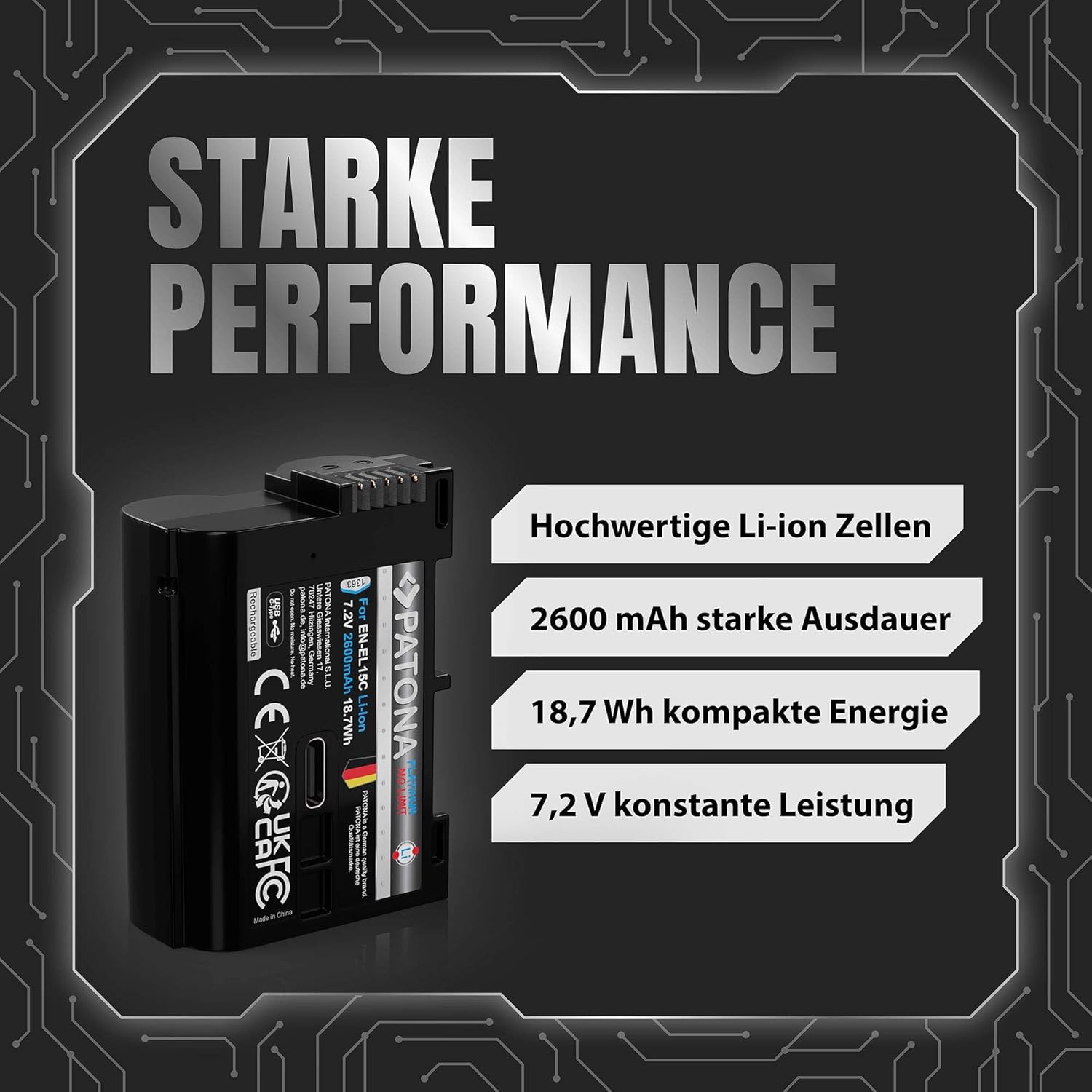 - ✅ HOCHLEISTUNGS-AKKU FÜR NIKON DSLR & Z-SERIE – Der PATONA PLATINIUM EN-EL15C Akku mit 2600mAh, 7.2V und 18,7Wh liefert zuverlässige Energie für deine Nikon Z6, Z6 II, Z6 III, Z7, Z7 II, Z8, D850, D810, D750, D500, D610 & mehr.