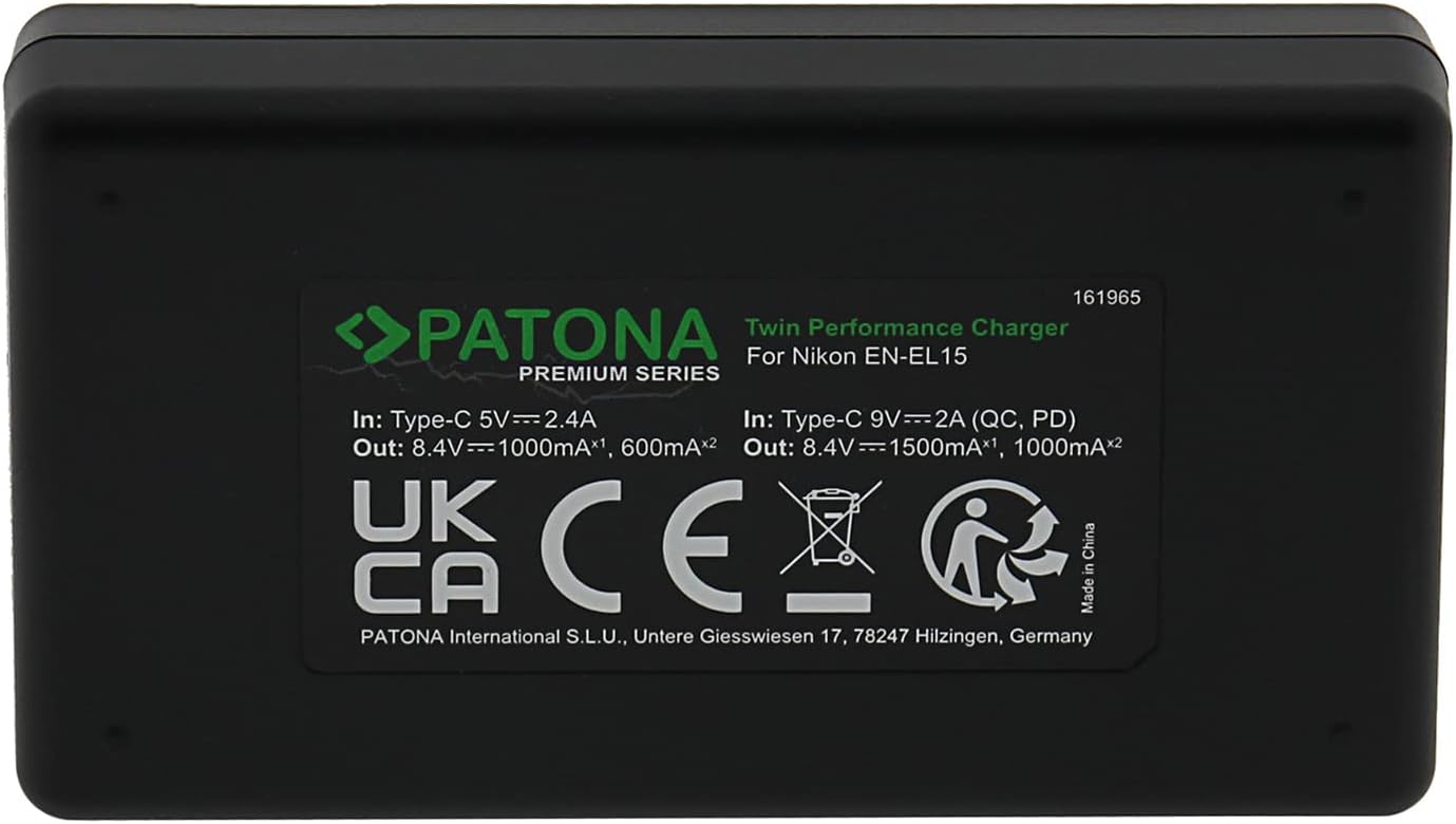 - LIEFERUMFANG: 2x PATONA Protect Akku EN-EL15c / 1x PATONA PD Performance Ladegerät 161945 / 1x USB-C auf USB-C Kabel / Transportsäckchen / Bedienungsanleitung