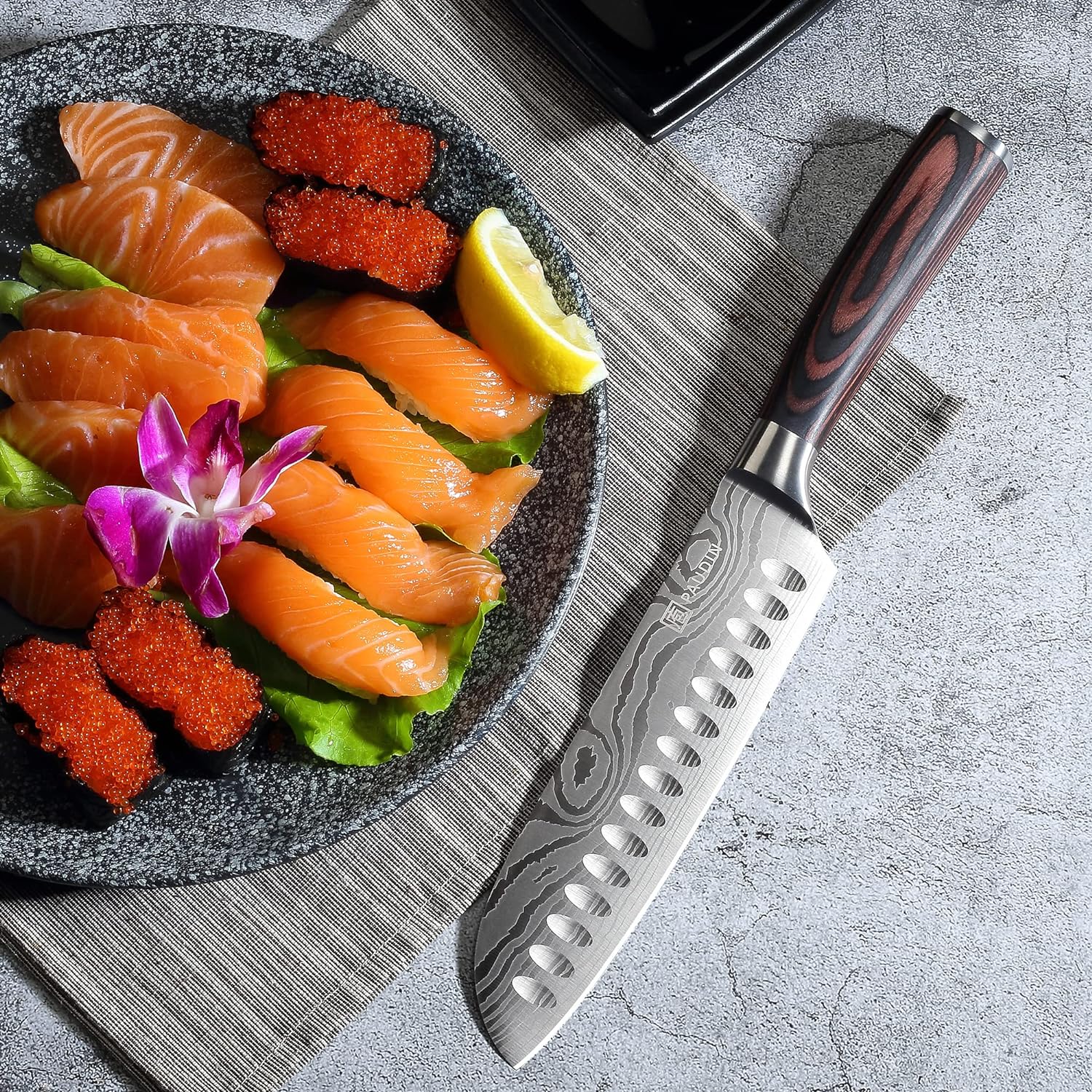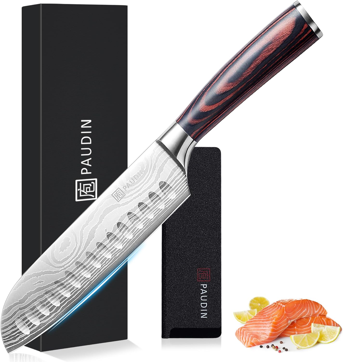- Mutifunktional: Das Santokumesser ist ein handliches Kochmesser mit 17 cm Klingenlänge. Ein ideales Küchenmesser für Kochfreunde, Hobbyköche und Professionals zum Schneiden, Hacken, Wiegen von Gemüse, Obst, Fisch & Fleisch. Entworfen für vielfältige Zwecke und professionelle Anwendungsbereiche, es ist wirklich ein Allzweckmesser.