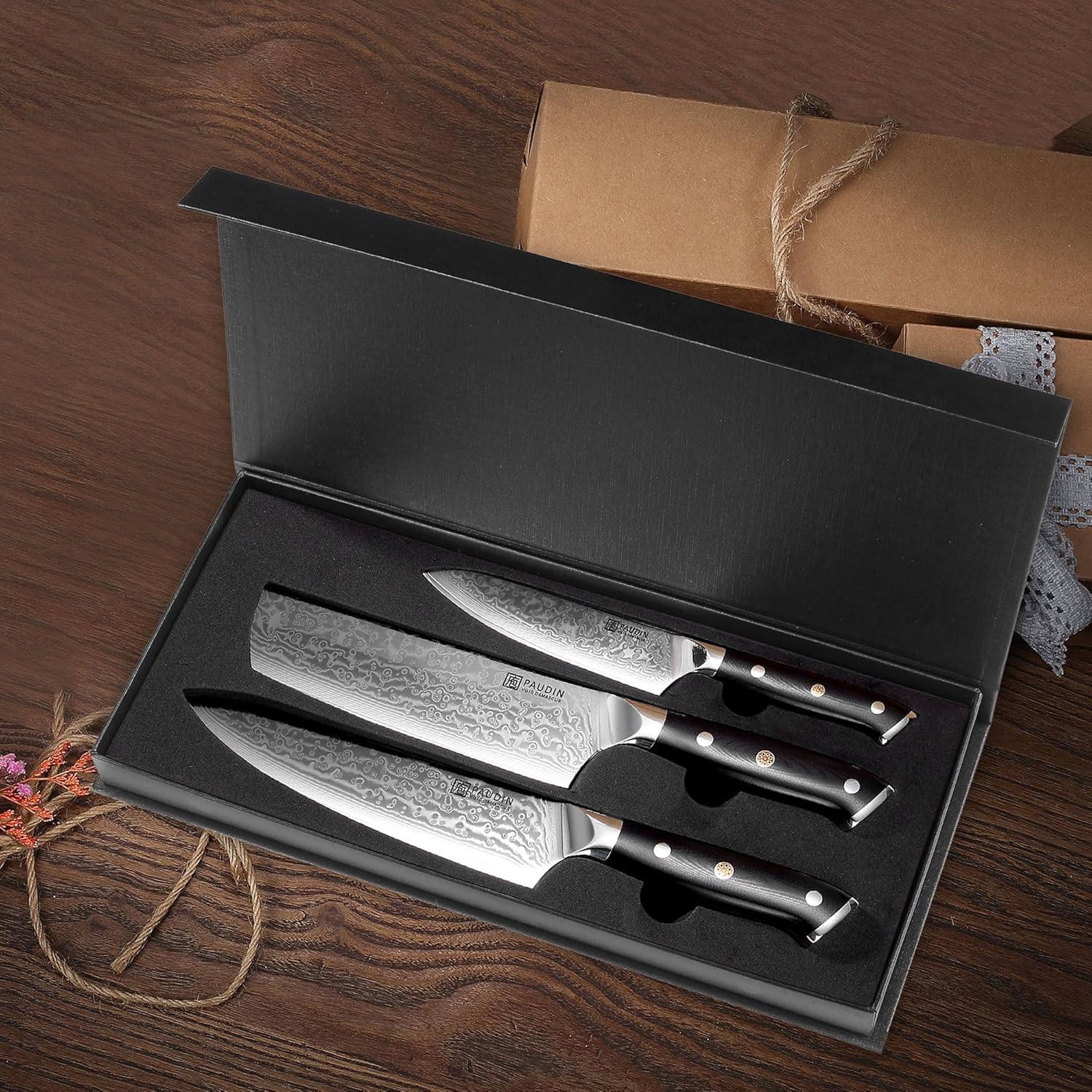 - 3-teiliges Messerset: Das PAUDIN Damastmesser-Set umfasst ein 20 cm Kochmesser, ein 17 cm Hackmesser und ein 13 cm Allzweckmesser. Diese vielseitigen Küchenmesser eignen sich perfekt zum Hacken, Schneiden, Zerkleinern und Filetieren von Fleisch, Gemüse