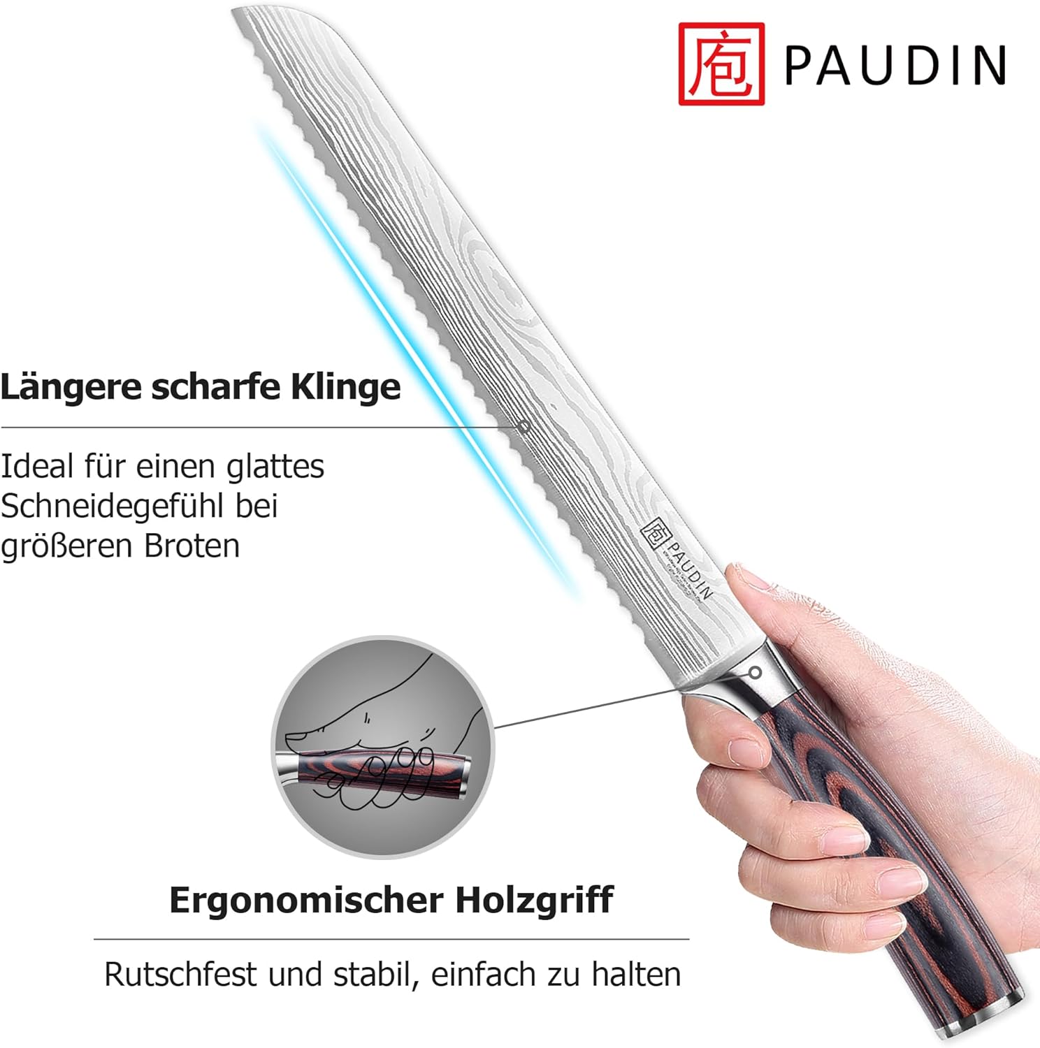 - Hochwertige Materialien: Das professionelle Brotmesser mit 26 cm Klinge ist aus rostfreiem deutschem Edelstahl mit hohem Kohlenstoffgehalt gefertigt (KEIN Damastmesser). Die Klinge ist definitiv rostfrei und hat eine Rockwell-Härte von 56-58, die für