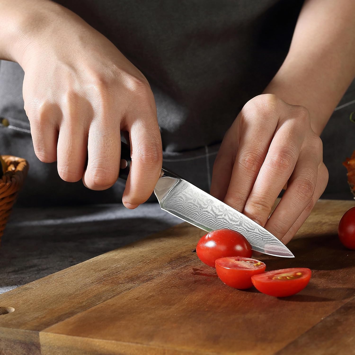 - Aussergewöhnliche Leistung: Dieses 9 cm Damast-Obstmesser bietet eine ultrascharfe Klinge für präzise Schnitte und hervorragende Kontrolle. Es schneidet mühelos nahezu alle Obst- und Gemüsesorten und sorgt für ein besonders geschmeidiges