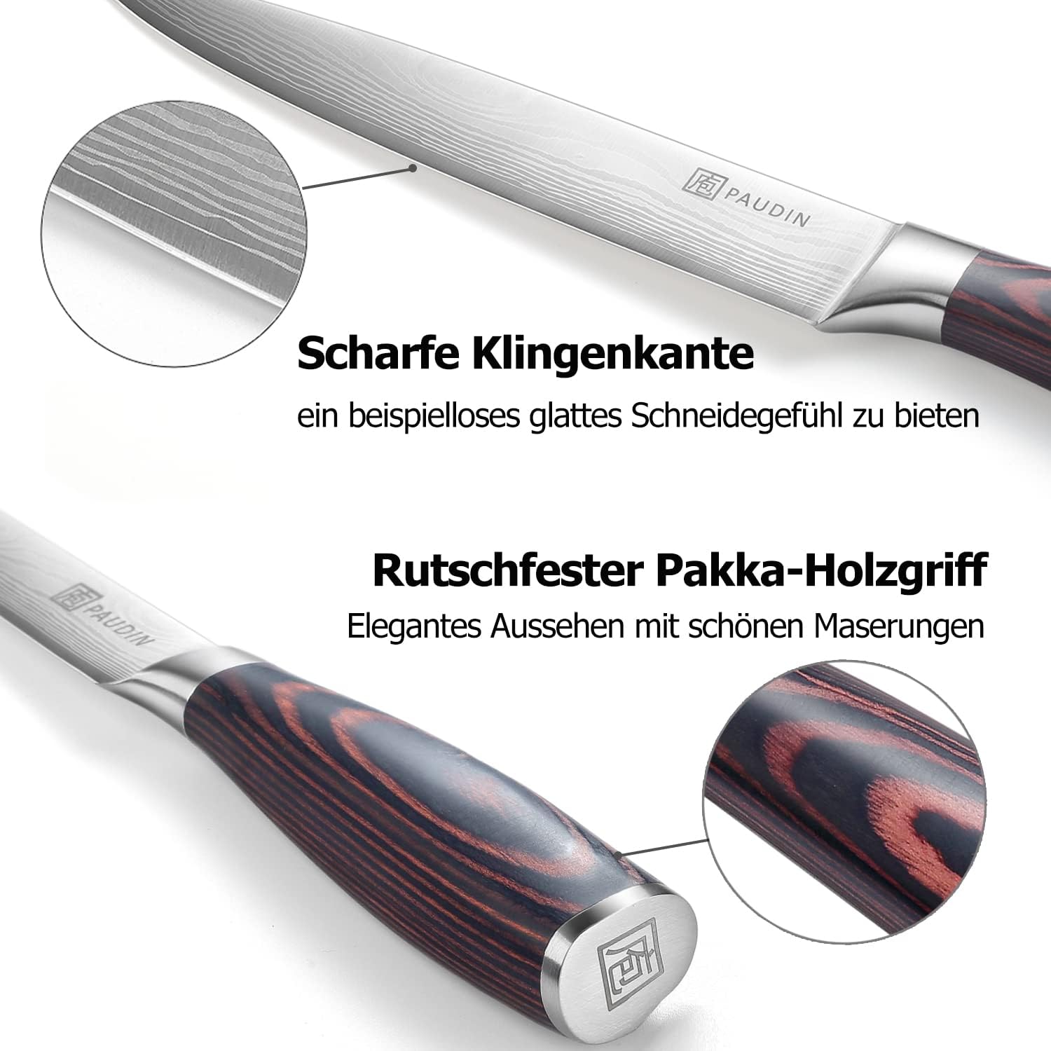 - Ergonomischer Griff: PAUDIN Messer mit ergonomischem geformtem Holzgriff sorgt für Gleichgewicht und Kontrolle. Dadurch bietet Messer beim Schneiden eine bequeme Behandlung und Sicherheit. Das küchenmesser ermöglicht die passende Balance zwischen Gewicht und Aussehen, schön zu sein und einfach zu verwenden. Dieses scharfe Messer ist sowohl für Linkshänder als auch für Rechtshänder geeignet