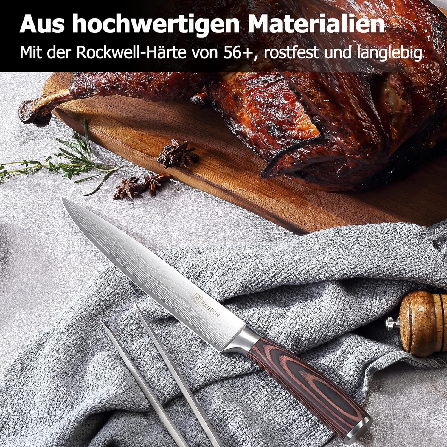 - Hervorragendes Kochmesser: Das ist ein Fleischmesser für Profis und Hobbyköche mit einer Klingelänge von 20 cm und besticht durch sein klassisches, zeitloses Design. Die schmale und lange Klingen aus Edelstahl sind sehr flexibel, ideal zum Schneiden, Zubereiten, Tranchieren und Servieren von Fleisch, Schinken und Fisch