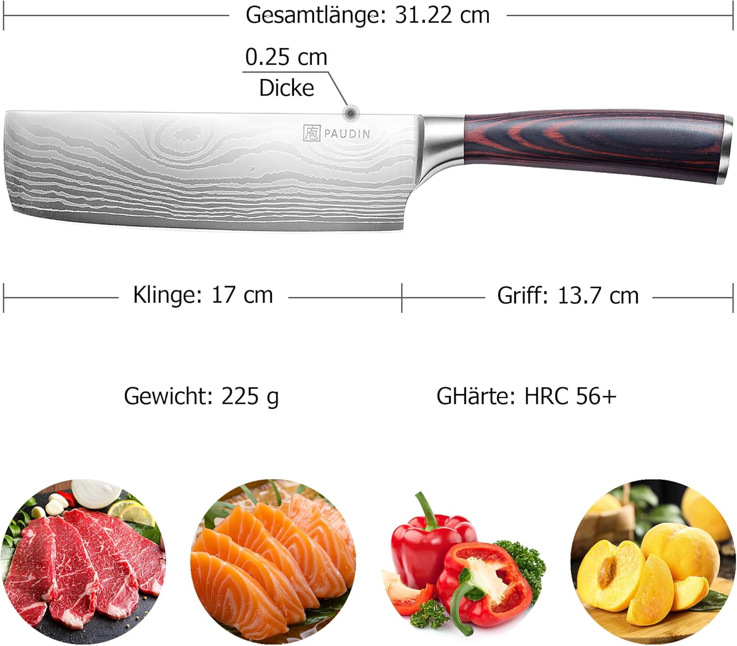 - Klassisches Kochmesser: Das chinesisches Kochmesser kann die tägliche Arbeit Ihrer Küche behandeln. Dank der scharfen Klinge von dem Nakiri Messer gelingt die Zubereitung von Fleisch, Fisch und Gemüse. Das Hackmesser kann auch effektiv Gemüse in kleinen Würfeln sowie Fleisch leicht hacken.