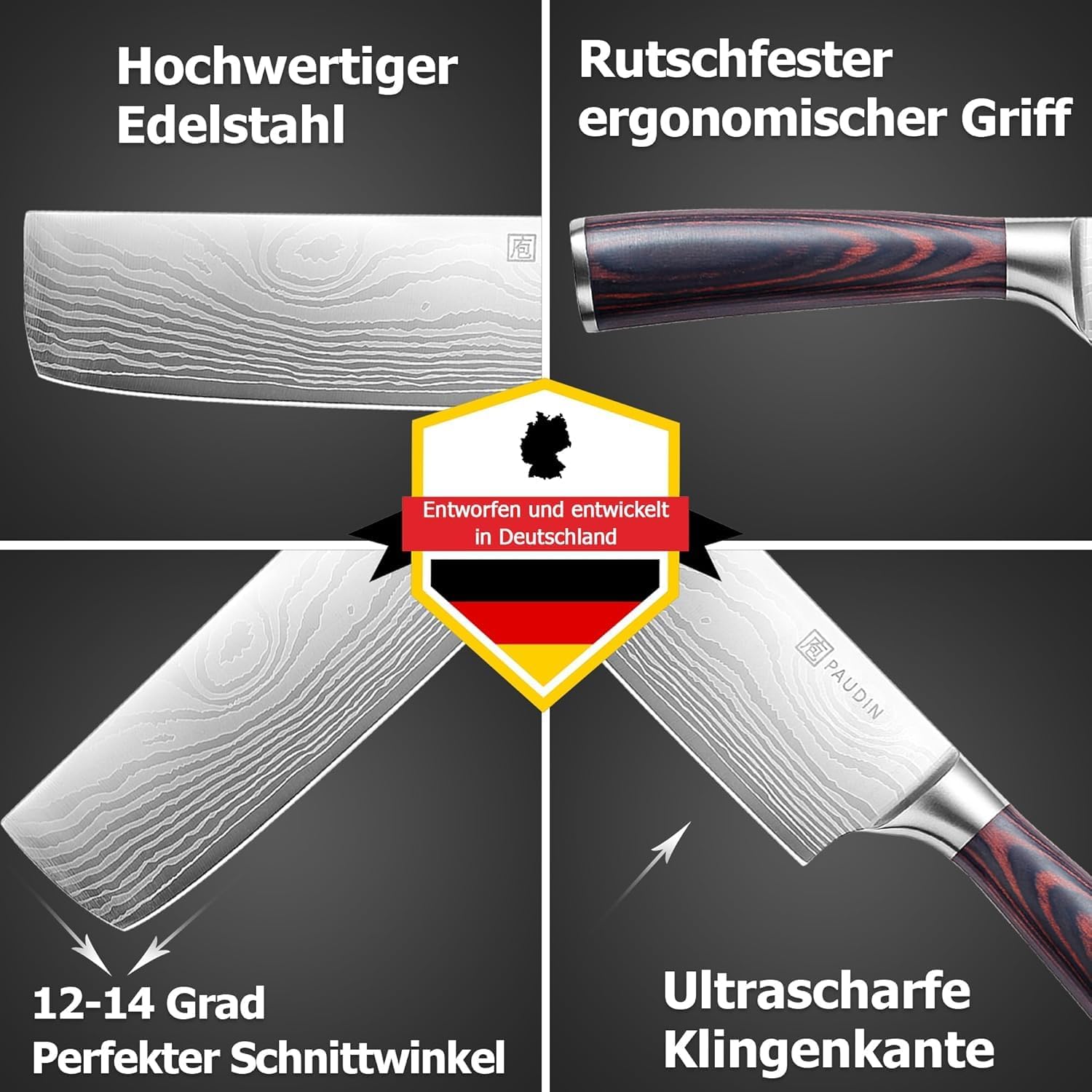 - Ultrascharfe Klinge: Ultra Scharfe Klinge ist aus hochwertigem deutschem Edelstahl. Die Klinge ist definitiv rostfest. Dies gibt dem Kochmesser eine feine glatte Oberfläche, ideal um Fleisch oder Obst und Gemüse mühelos zu schneiden.