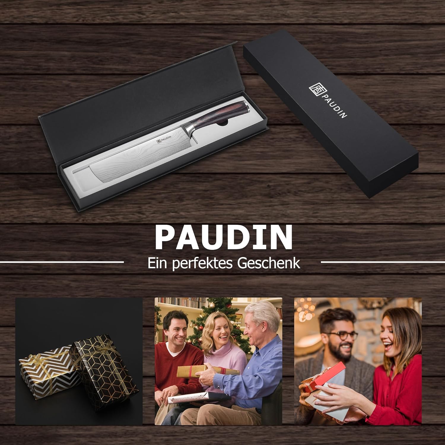 - Hochwertige Materialien: Das professionelle Küchenmesser mit 17cm Klinge ist aus rostfreiem deutschem Edelstahl mit hohem Kohlenstoff hergestellt. (Hochwertiger Spezialedelstahl 5cr15mov, KEIN Damastmesser) Es ist mit der Rockwell-Härte von 56-58, welcher sich durch hoher Qualität auszeichnet, ist schnitthaltig und langlebig.