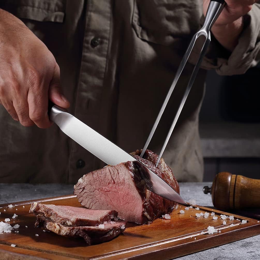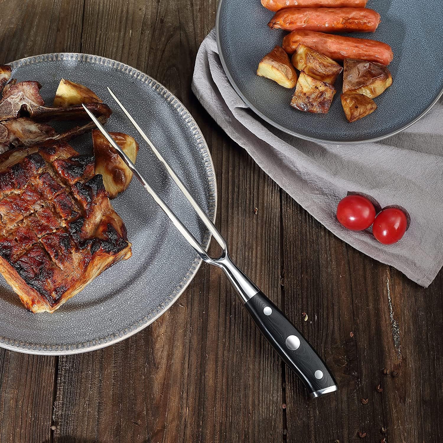 - Extrem scharfe Klinge:Das Fleischmesser set aus 1.4116 deutsch Edelstahl mit hohem Kohlenstoffgehalt hergestellt. Die lange schmale Klinge dieses Tranchiermesser eignet sich hervorragend für alle Arten von Schnitten, insbesondere zum Schneiden von grossen Braten und grossen weichen Obst- und Gemüsesorten. Es wird auch seine Zähigkeit und Funktionalität für eine lange Zeit beibehalten.