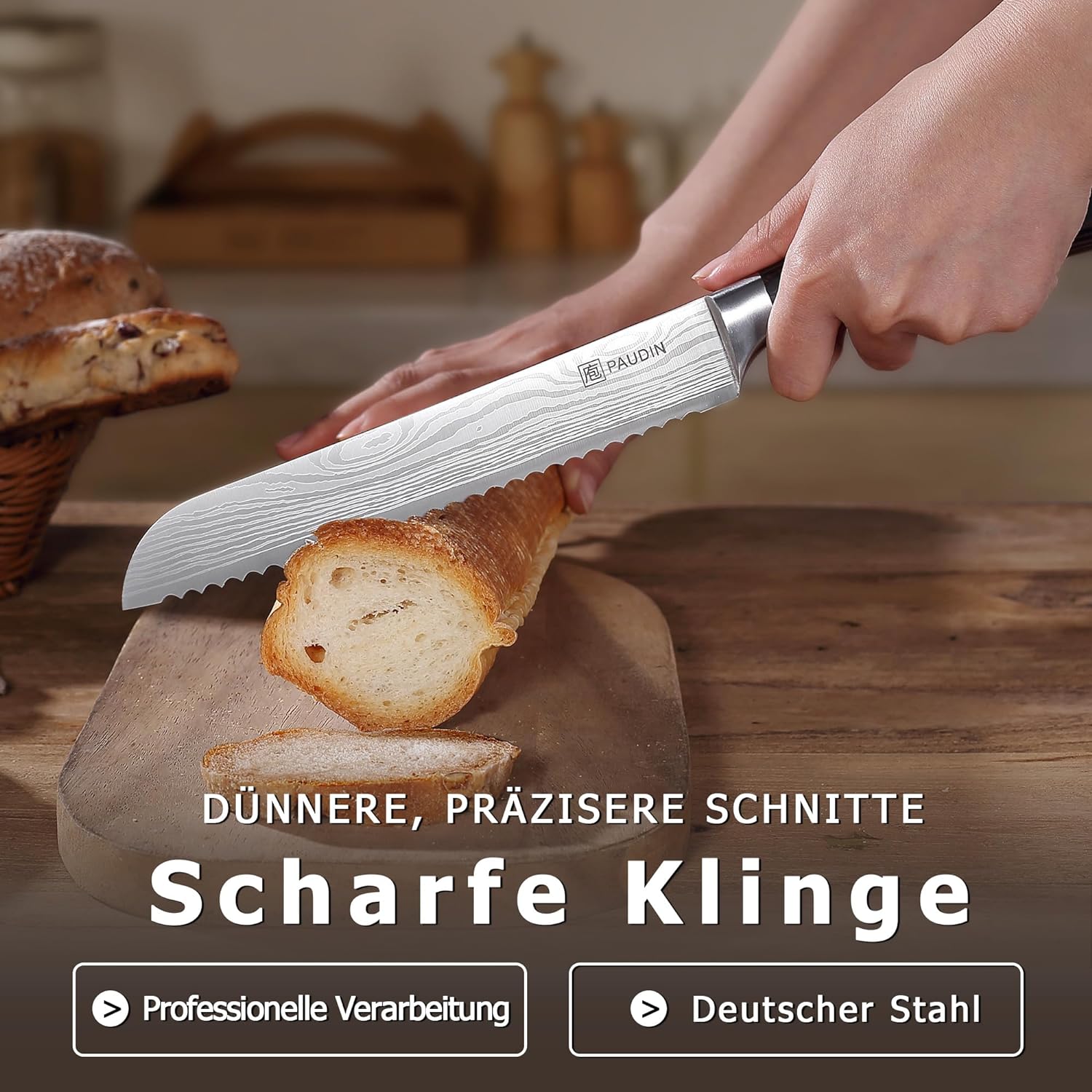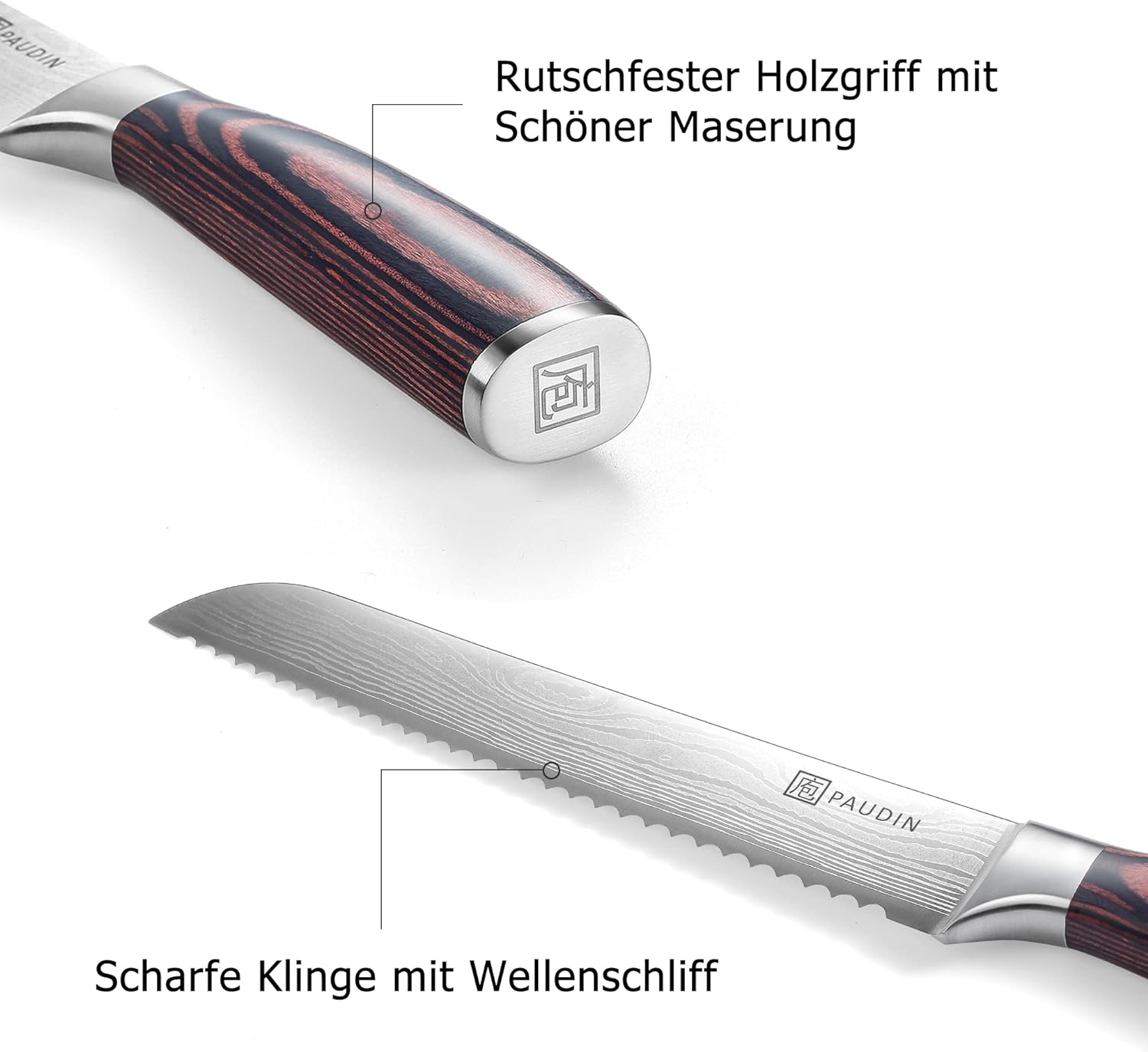 - Ergonomischer Griff: Der Griff des Messers ist für seine Handhabung, Komfort, Stärke und Stabilität bekannt. Durch den ergonomisch geformten Griff aus elegantem Holz mit integriertem Fingerschutz arbeiten Sie immer sicher und schnell. PAUDIN Brotmesser ist optimal für unterschiedlichen Hände geeignet.