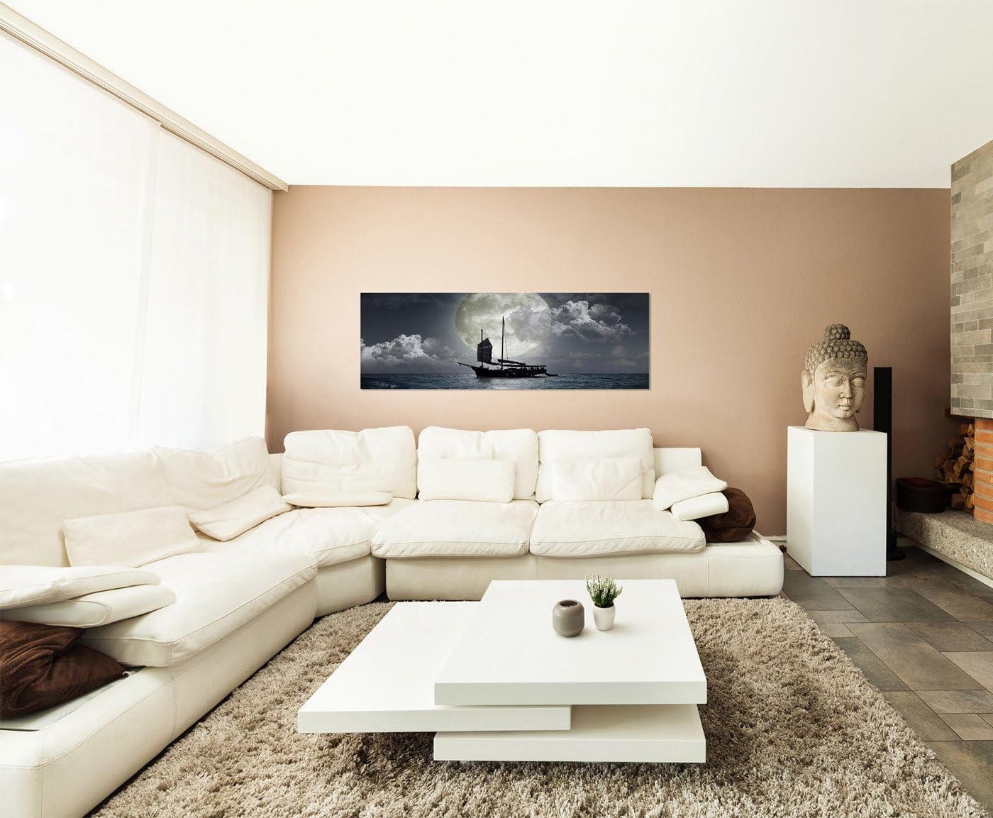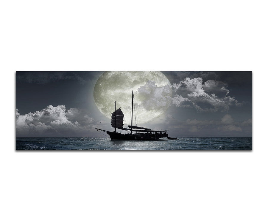 Paul Sinus Art Panoramabild auf Leinwand und Keilrahmen 150x50cm Meer Nacht Vollmond Segelschiff