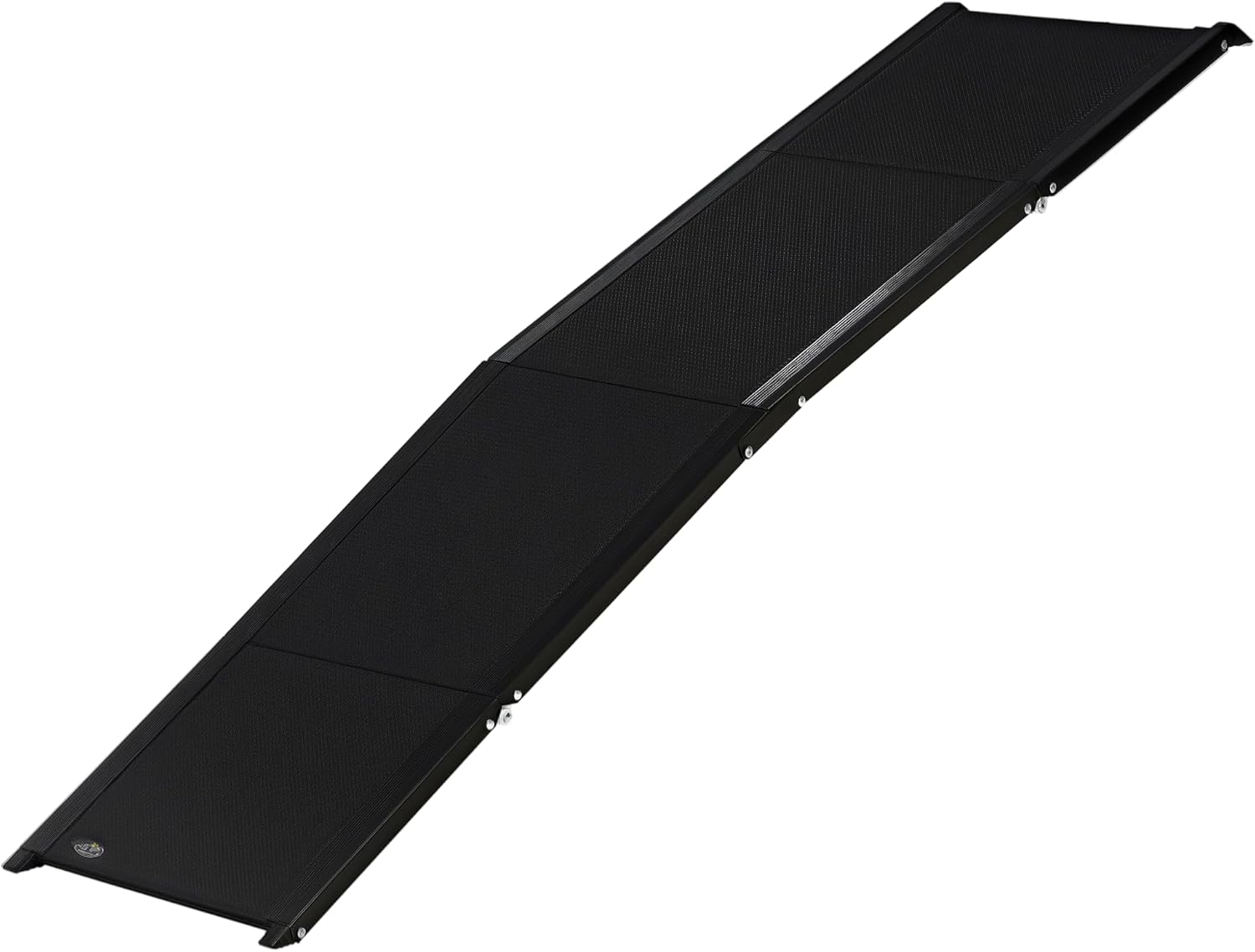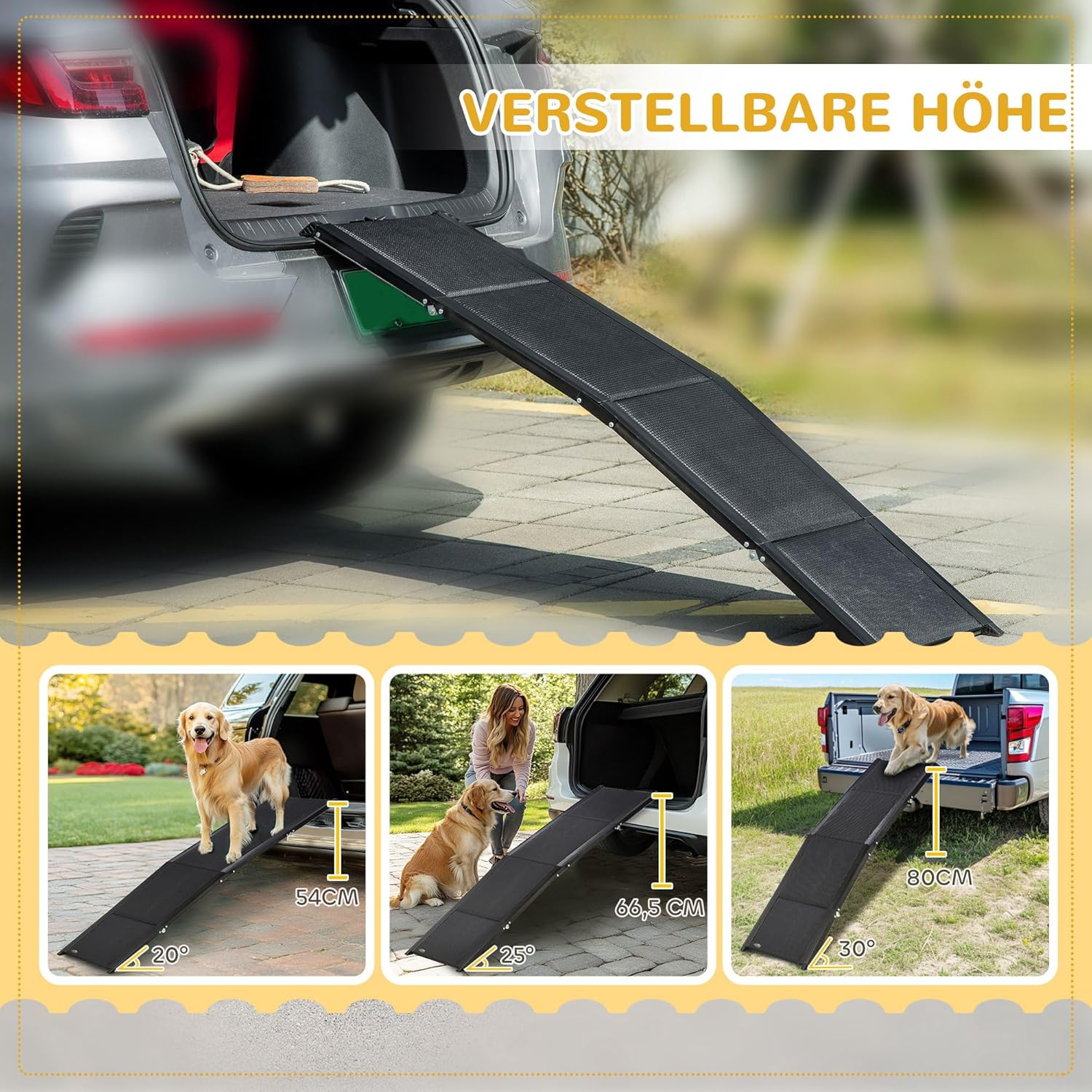- Produktmasse der Hunderampe: Offen: 158L x 43,5B x 2,5H cm; Gefaltet: 45L x 43,5B x 13H cm; Maximale Anwendbare Höhe: 80 cm bei einem Neigungswinkel von 30°. Montagefrei.