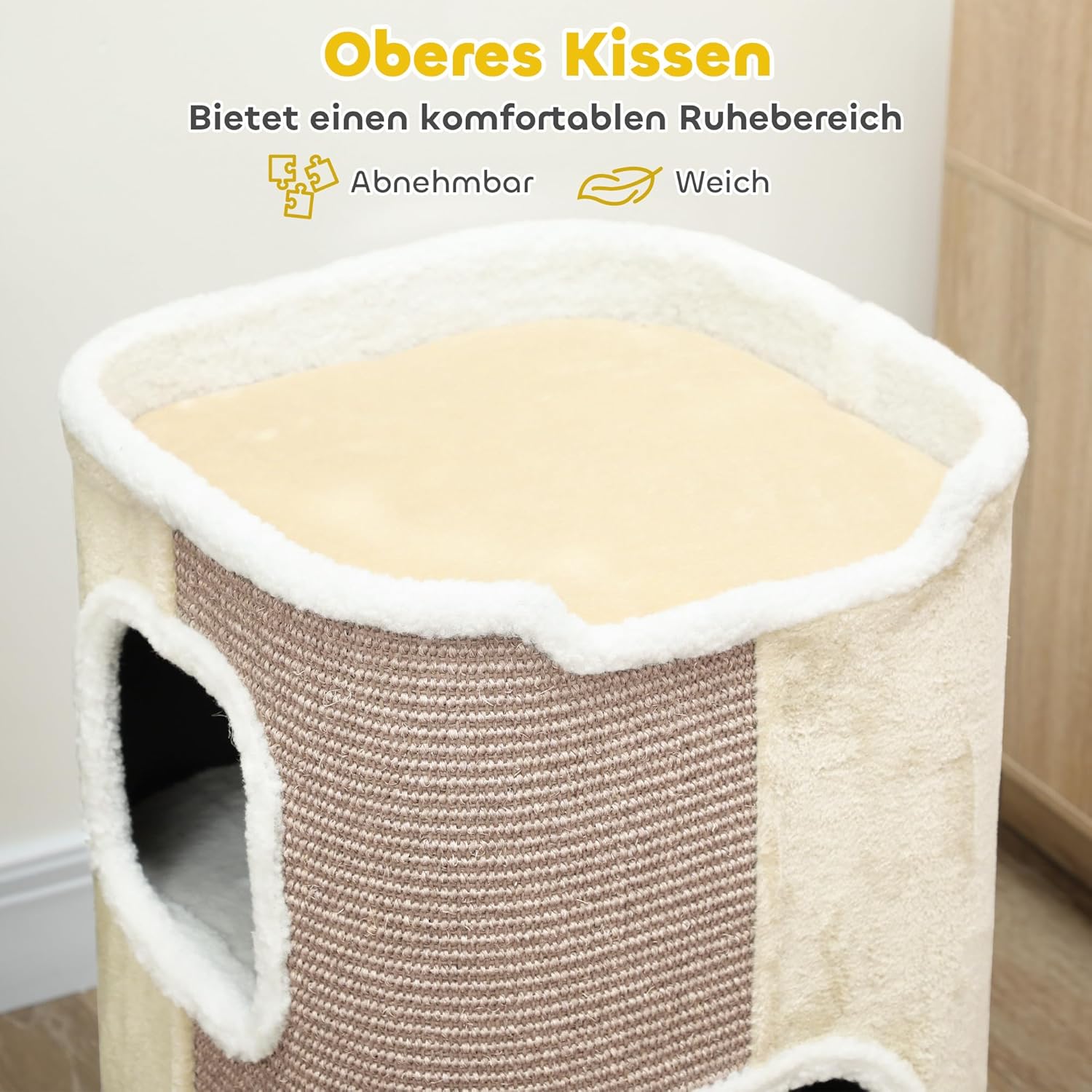 - Drei Bereiche: Dieses Katzenkratzbaum hat insgesamt drei Schichten und 2 grosse Löcher, die sie miteinander verbinden, damit sie sich bewegen können. Ein idealer Ort zum Ausruhen und Entspannen.
