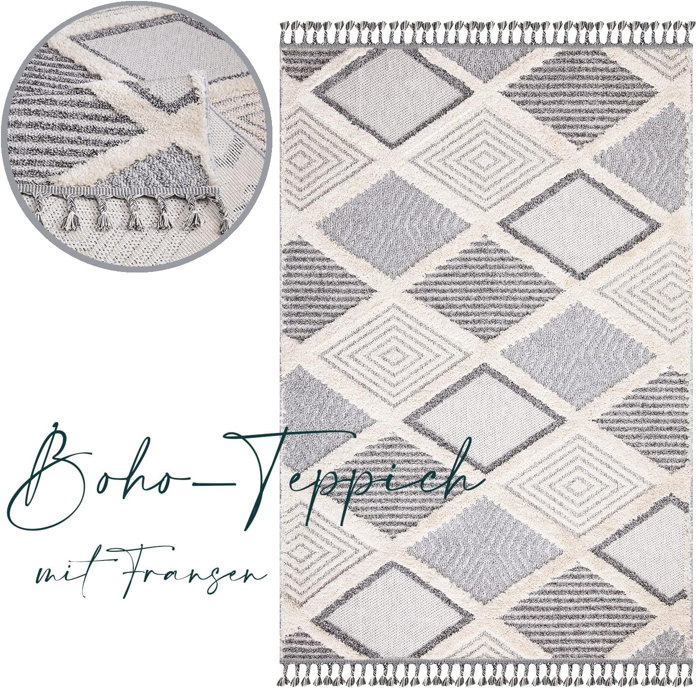payé Teppich Wohnzimmer - Raute Muster - 160x230cm Creme Grau Blau - Fransen Deko Boho Flauschig - C