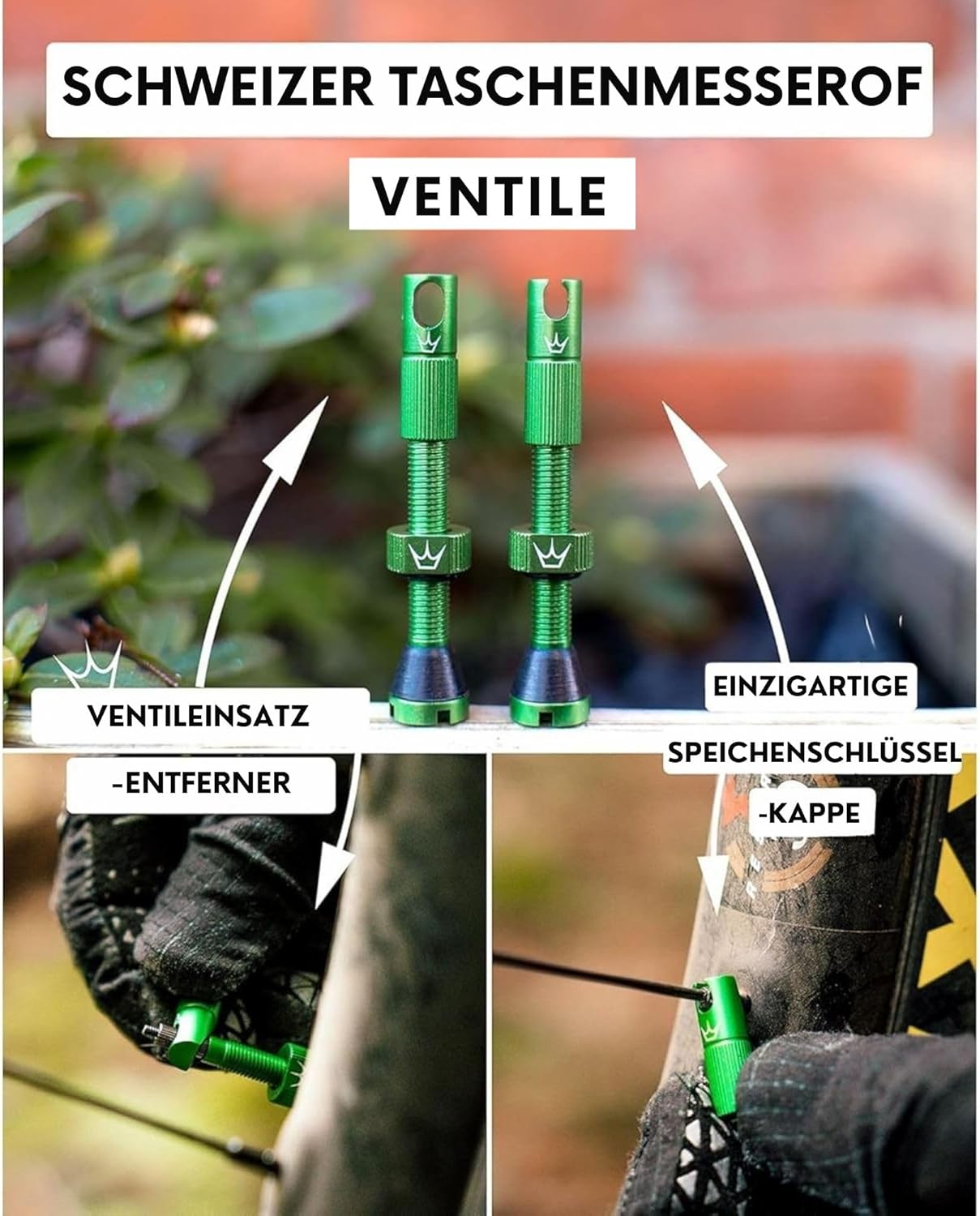- Von Fahrern für Fahrer entworfen. Unsere Ventile werden standardmässig mit einer integrierten Ventilkernentfernerkappe und Speichenschlüsselkappe (für Standard-3,4-mm-Speichennippel) geliefert. Dadurch wird das Anziehen loser Speichen und das