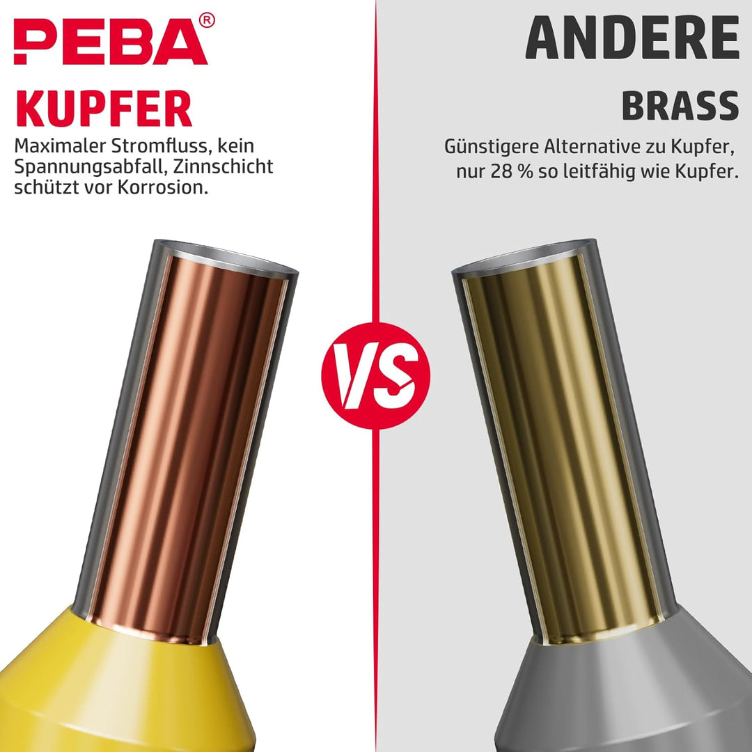 - Elektrische Sicherheit: Der Aderendhülsenleiter besteht aus verzinntem violettem Kupfer. Aufgrund seines hochreinen Kupferanteils hat Purpurkupfer im Vergleich zu Messing eine ausgezeichnete elektrische und thermische Leitfähigkeit, die elektrische