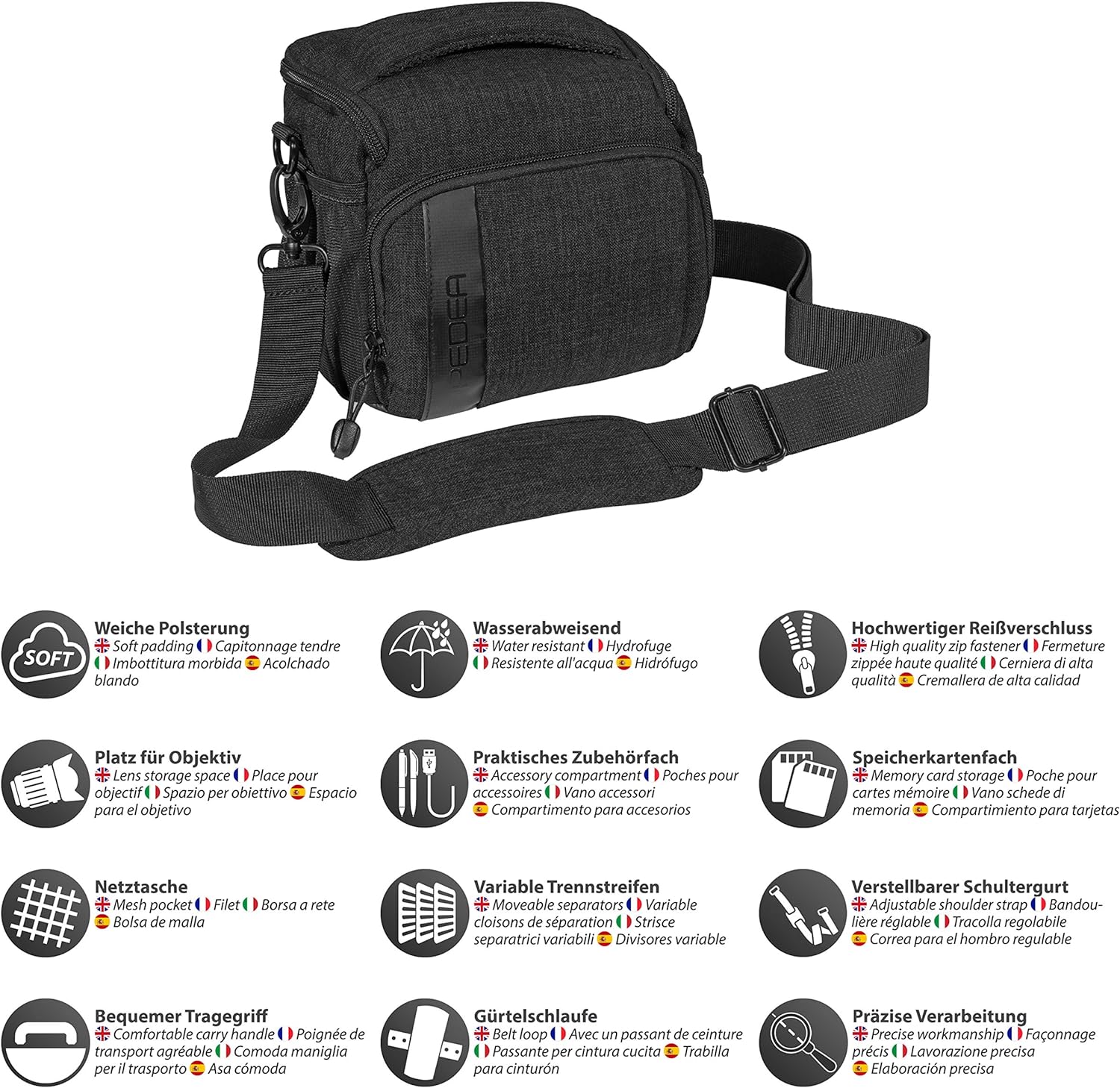 • Ausgestattet mit einem weichen Innenfutter, einer dicken Polsterung und einem wasserabweisenden Regenschutz, sodass Ihr Fotoapparat bestens vor Kratzern, Nässe und Stössen geschützt ist