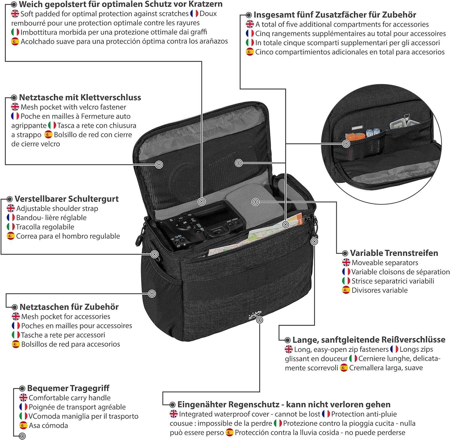 - Ausgestattet mit einem weichen Innenfutter, einer dicken Polsterung und einem wasserabweisenden Regenschutz, sodass Ihr Fotoapparat bestens vor Kratzern, Nässe und Stössen geschützt ist
