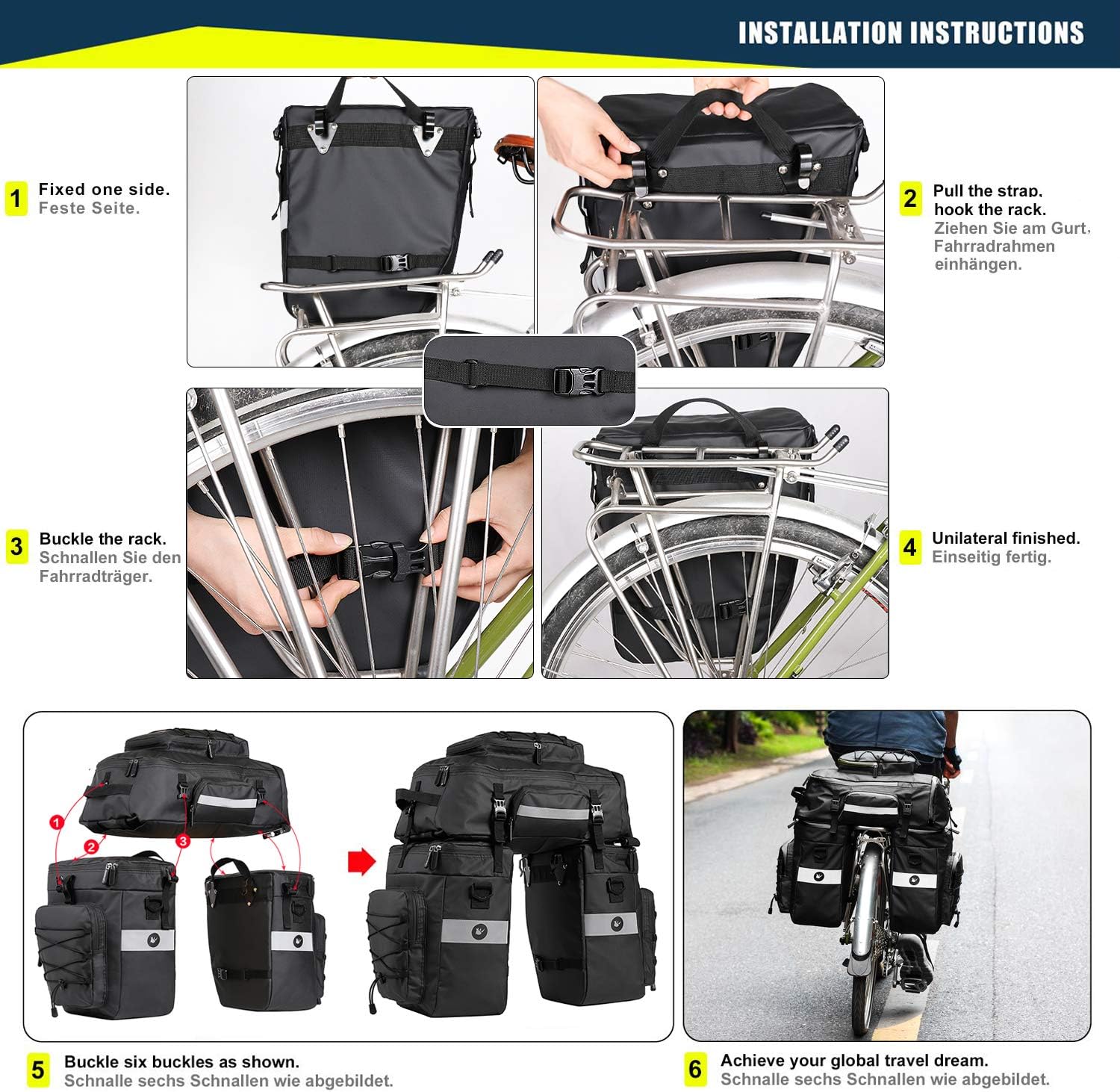 - Fahrradpacktaschen : Die Seitentasche hat zwei Metallhaken, die einfach mit der Fahrradhalterung verbunden werden können, um Vibrationen zu reduzieren und ein Reissen zu verhindern; die Seitentaschen und das Top-Paket sind fest, und jede Seite ist mit